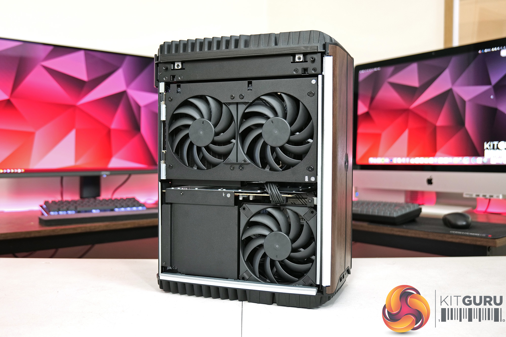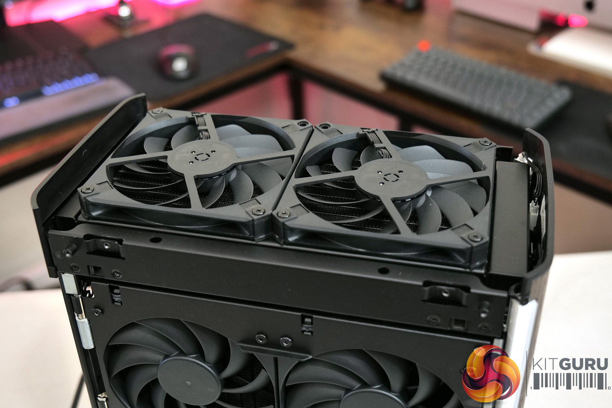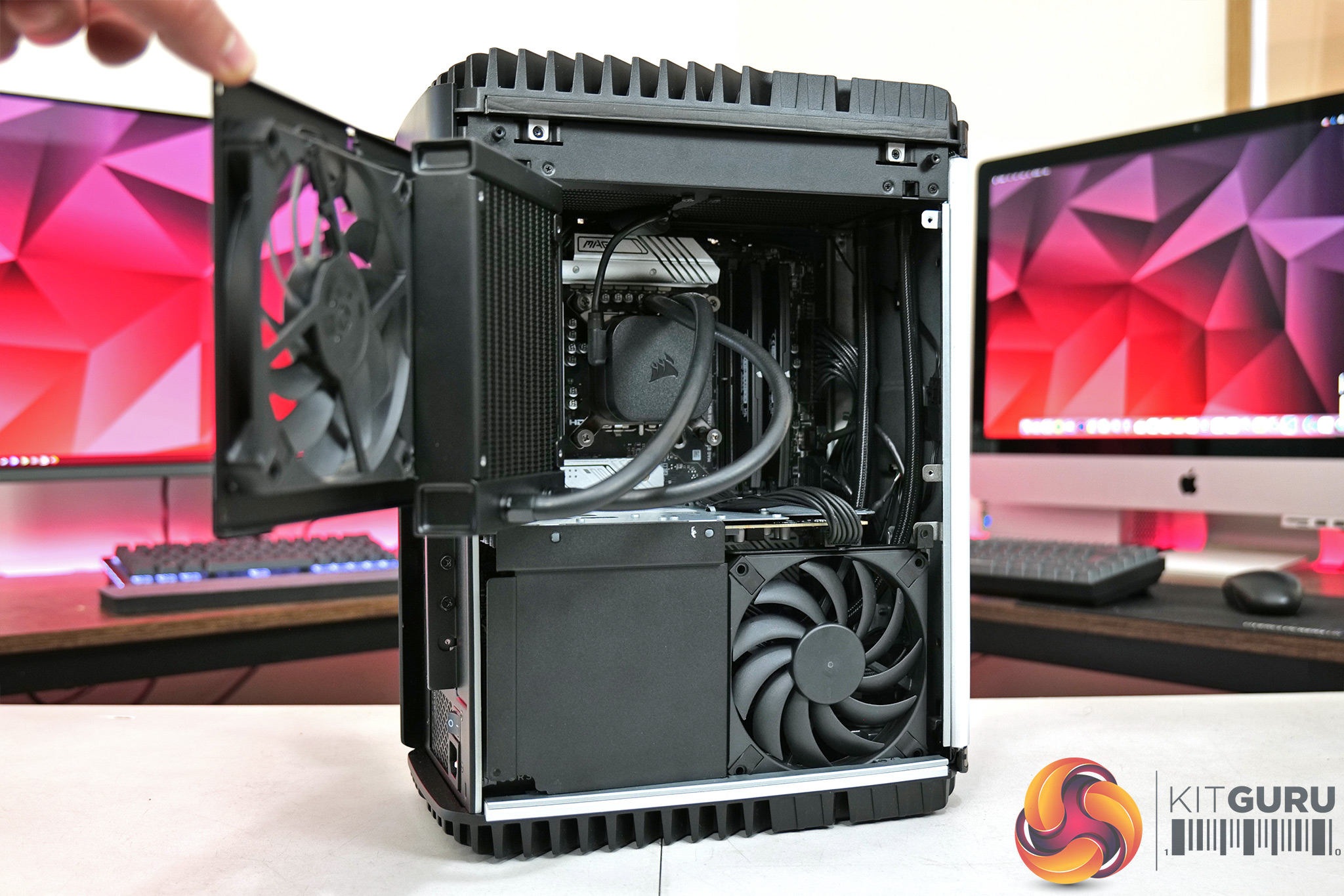 Accessing the internals is a three-part job. First just remove the left-side fabric filter, along with two screws at the top of the aluminium panel – the panel then pops out, revealing three intake fans which blow air into the chassis. Two more screws can be removed and the top fan bracket swings open as it's on a hinge. This then gives access to the CPU, memory and M.2 SSD slot. Four more screws can also be removed from the bottom bracket to remove it, opening up the lower half of the case and giving access to the PSU and GPU.