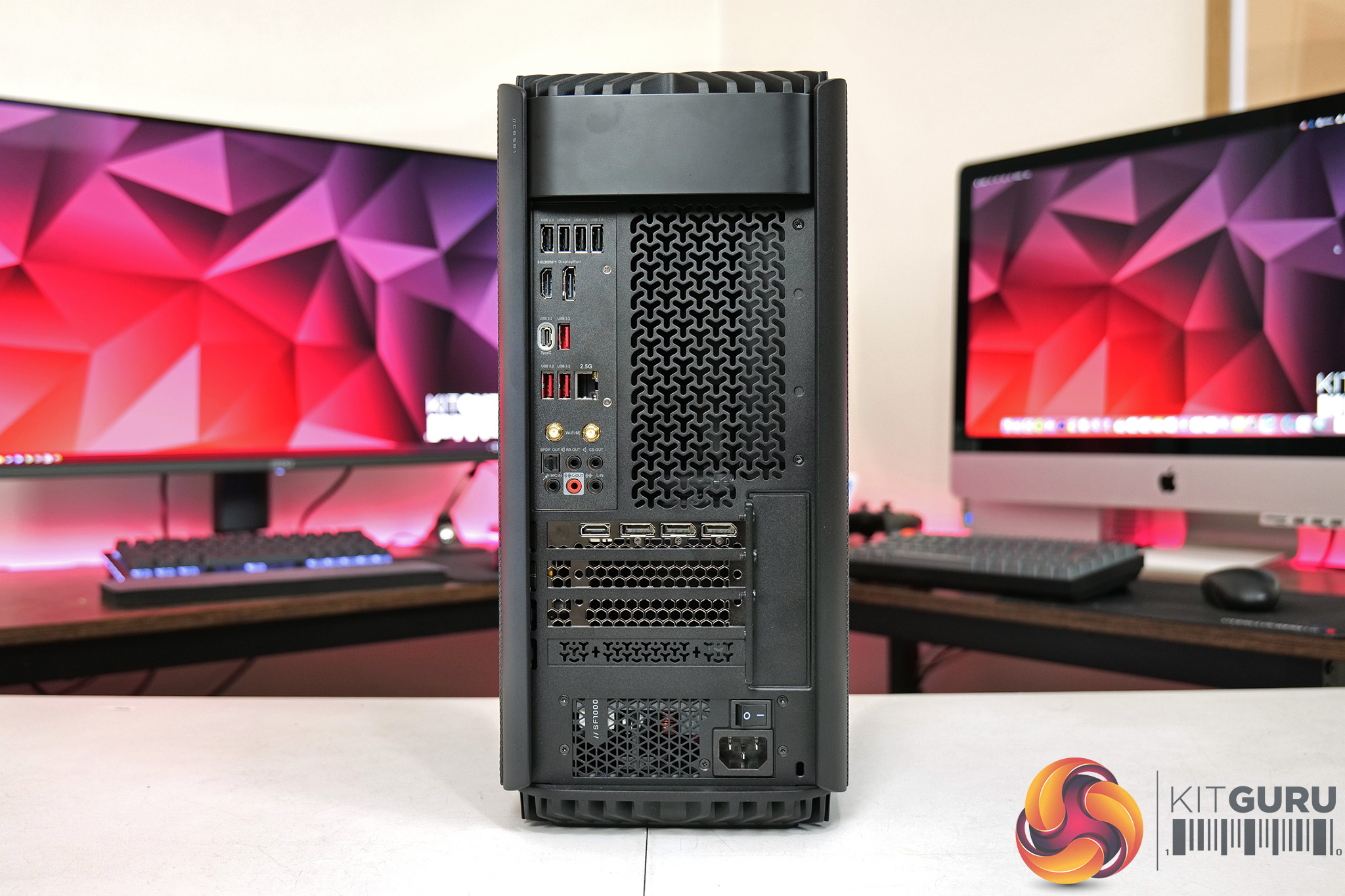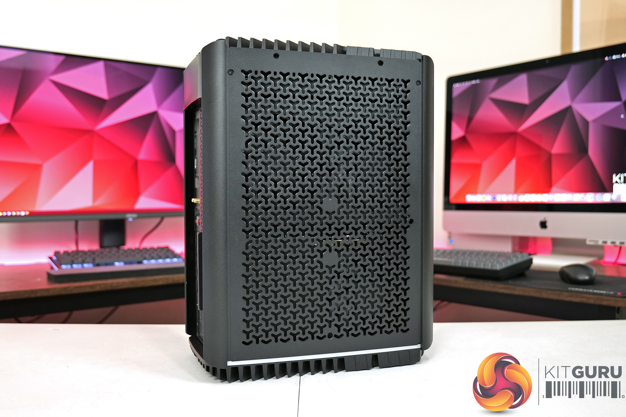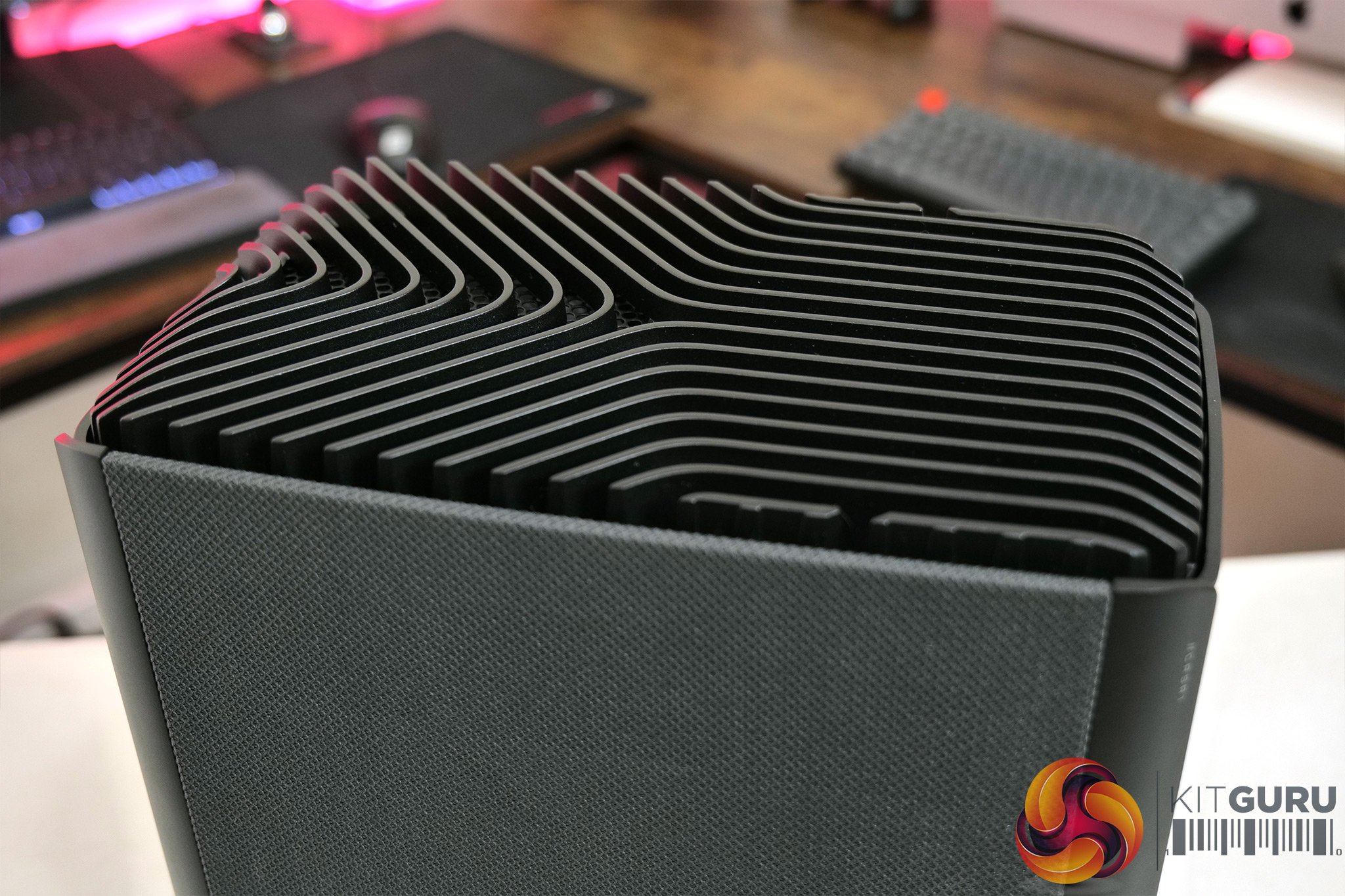 Both sides of the One are covered with grey fabric filters which I personally feel complements the aesthetic very well. These are magnetic and can simply be lifted away to reveal the perforated aluminium panels beneath. Then round the back, we find a very healthy selection of ports and connectors, with a ton of USB options, as well as the graphics card video outputs.