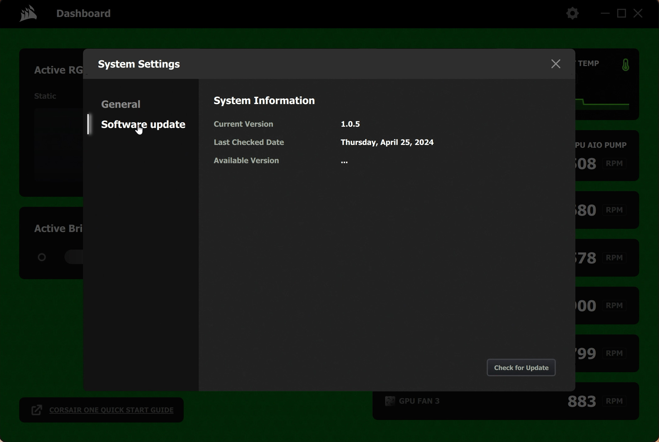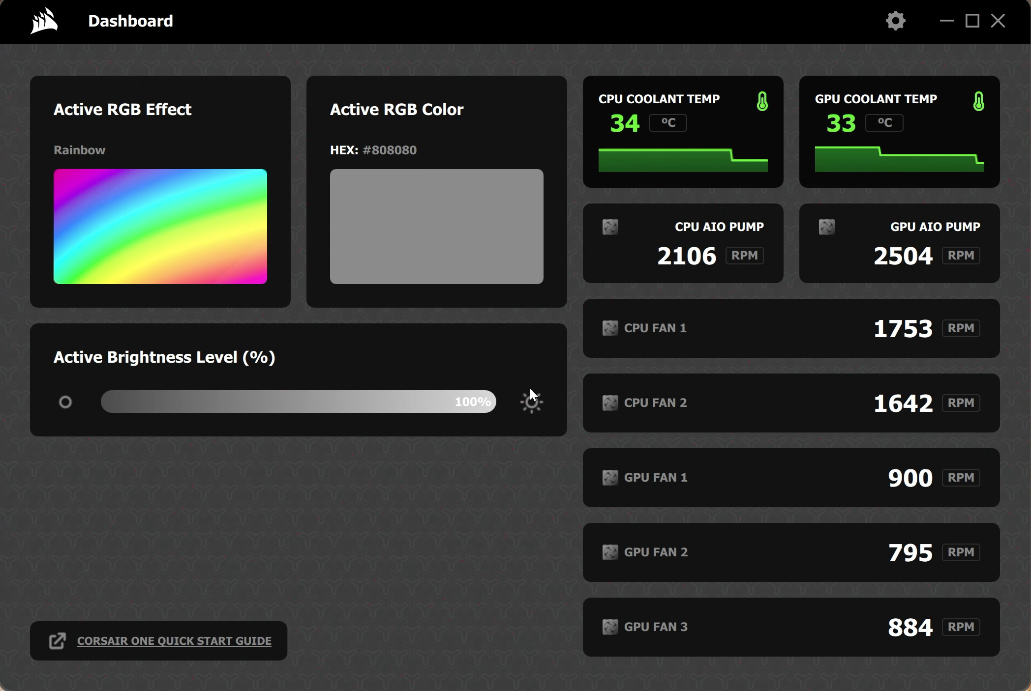 Finally, it is also worth mentioning that Corsair is not using iCUE to control the Corsair One. I was told this Corsair did not want to tie the system down with a specific piece of software that not everyone would want to use, something which also opens to the door to other operating systems being installed. Instead, Corsair developed a new Dashboard which simply controls the RGB lighting and shows a read-out of fan and pump speeds. It can also display system information and check for updates, but that's about it. For any fan curve or performance adjustments, users will need to access the BIOS or other third-party software.