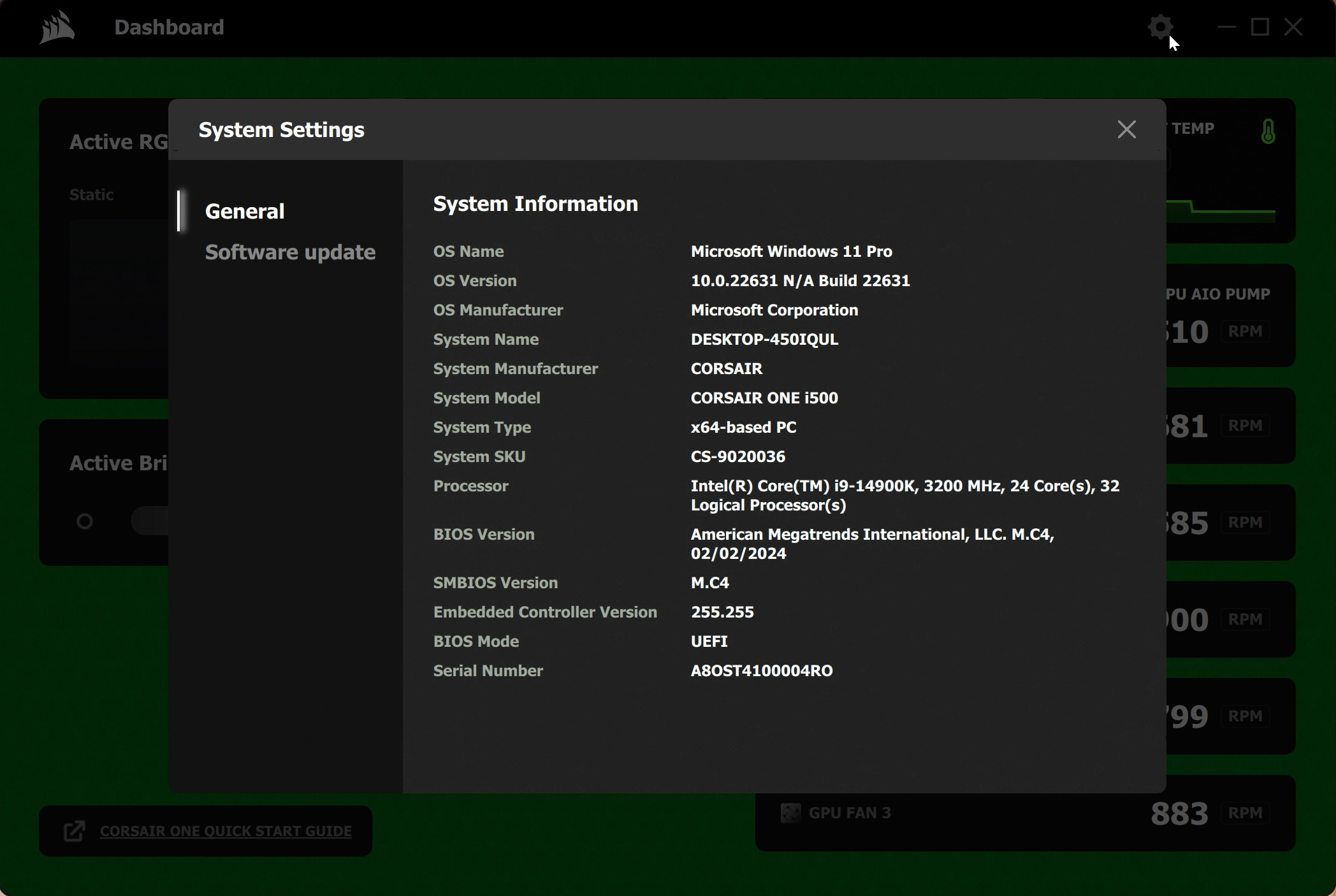 - Software: Windows 11 Pro 64-bit, Corsair Diagnostics, Corsair One Dashboard