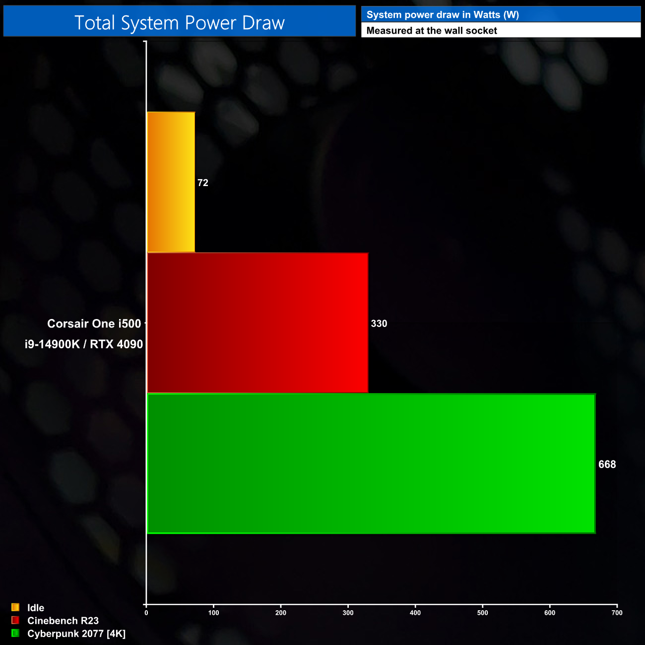 Lastly, total system power is nothing to worry about either. When gaming we saw almost 670W in Cyberpunk, but that's well below the 1000W capacity of the power supply, ensuring good levels of efficiency.