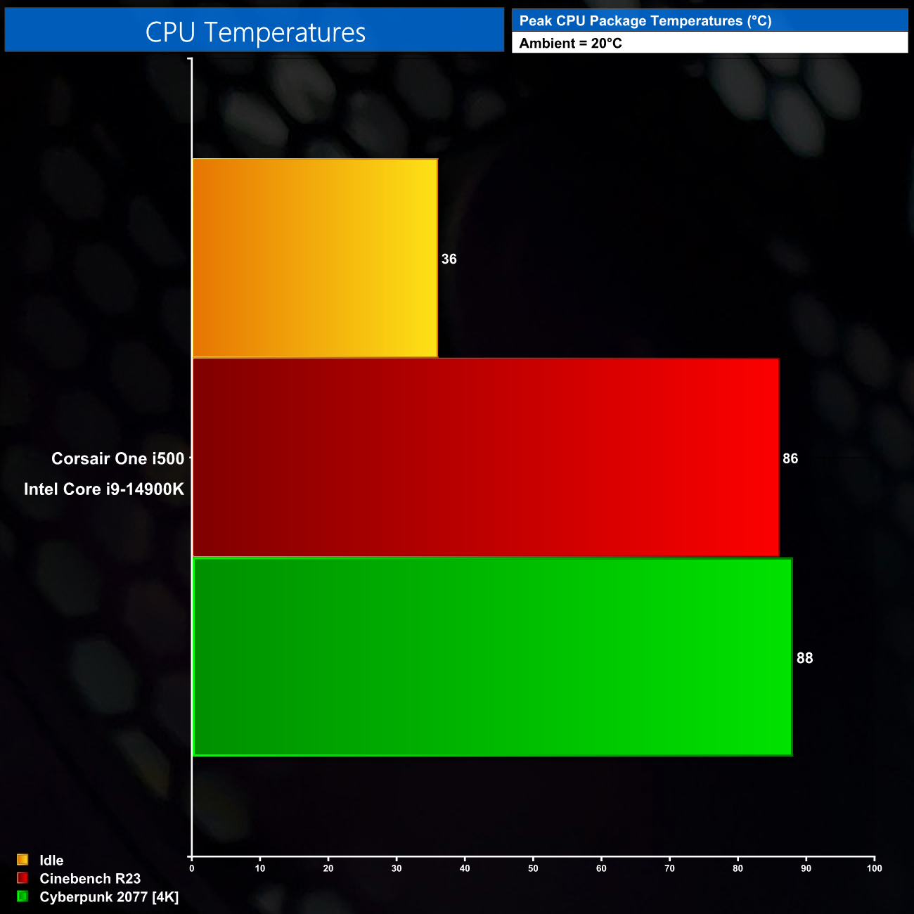 Moving onto CPU thermals, the 14900K gets warm, but not dangerously so, hitting 86C in Cinebench and 88C in Cyberpunk 2077. Limiting the PL1 to 200W definitely helps considering the CPU is only cooled by a 120mm AIO, but by this CPU's standards, the thermals are well in check.