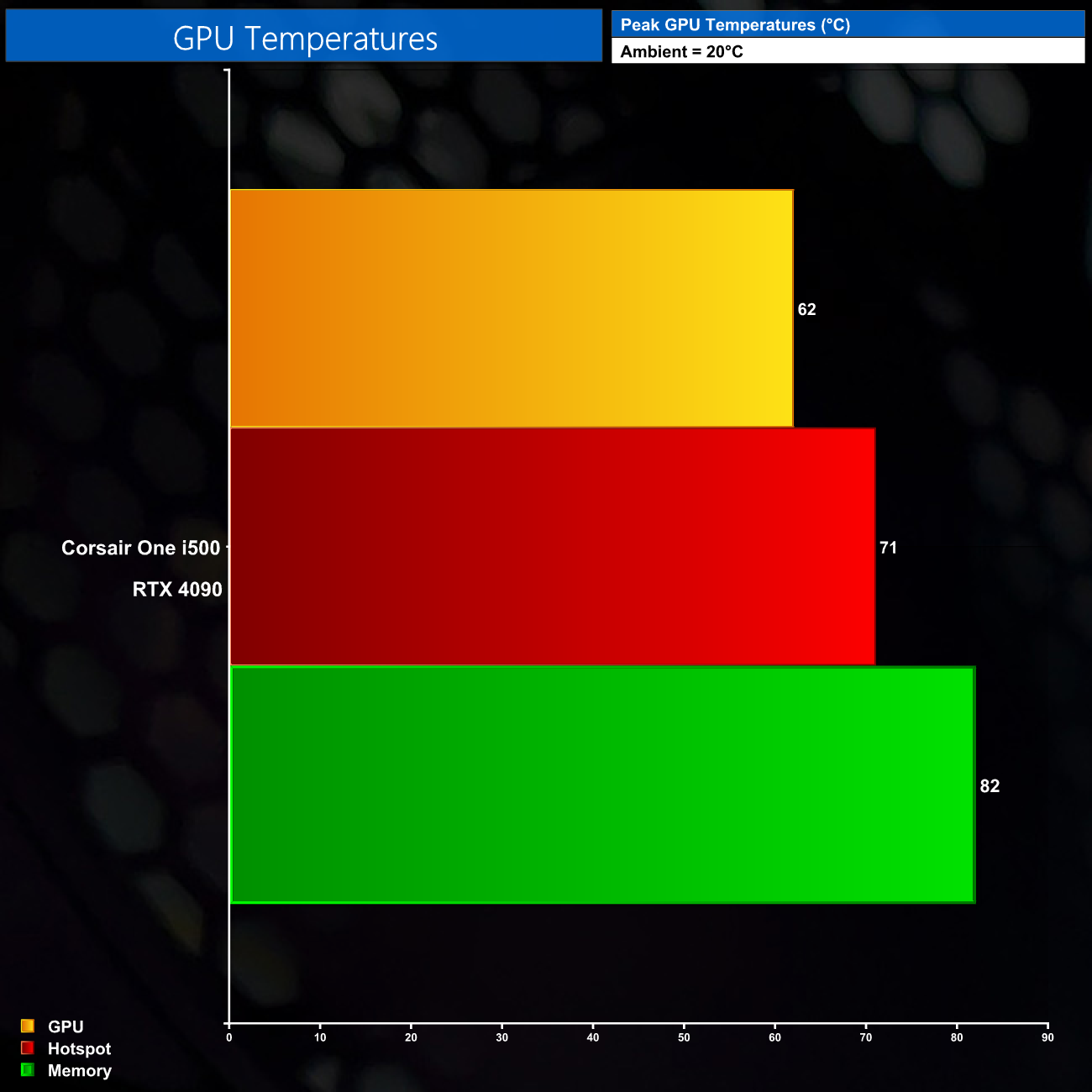 GPU thermals are also nothing to worry about as we saw the memory peak at 82C, with the GPU at 62C and the hot spot at 71C after a thirty minute stress test. Software tools don't report the MOSFET temperatures for the 4090 however, which I would be fascinated to know considering there are no heatsinks cooling the GPU VRM, but without the data all we can do is speculate.