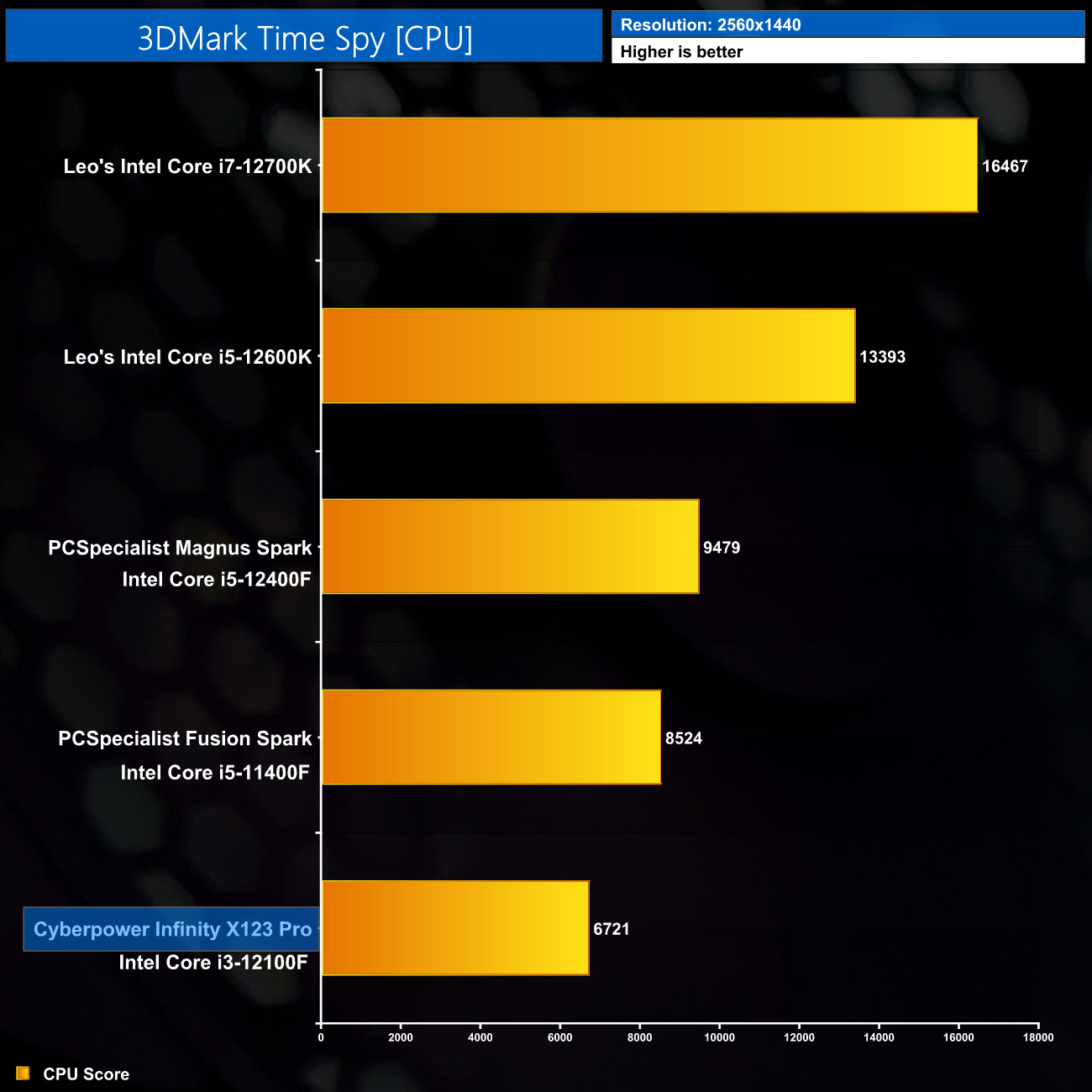 Kicking off with 3DMark Time Spy, looking at the CPU score. The i3-12100F is only a quad-core unit but still scores relatively well, though compared to the i5-12400F, it is obviously slower. Still, against the last generation i5-11400F, it is only 21% slower despite having 33% fewer cores, which is impressive.