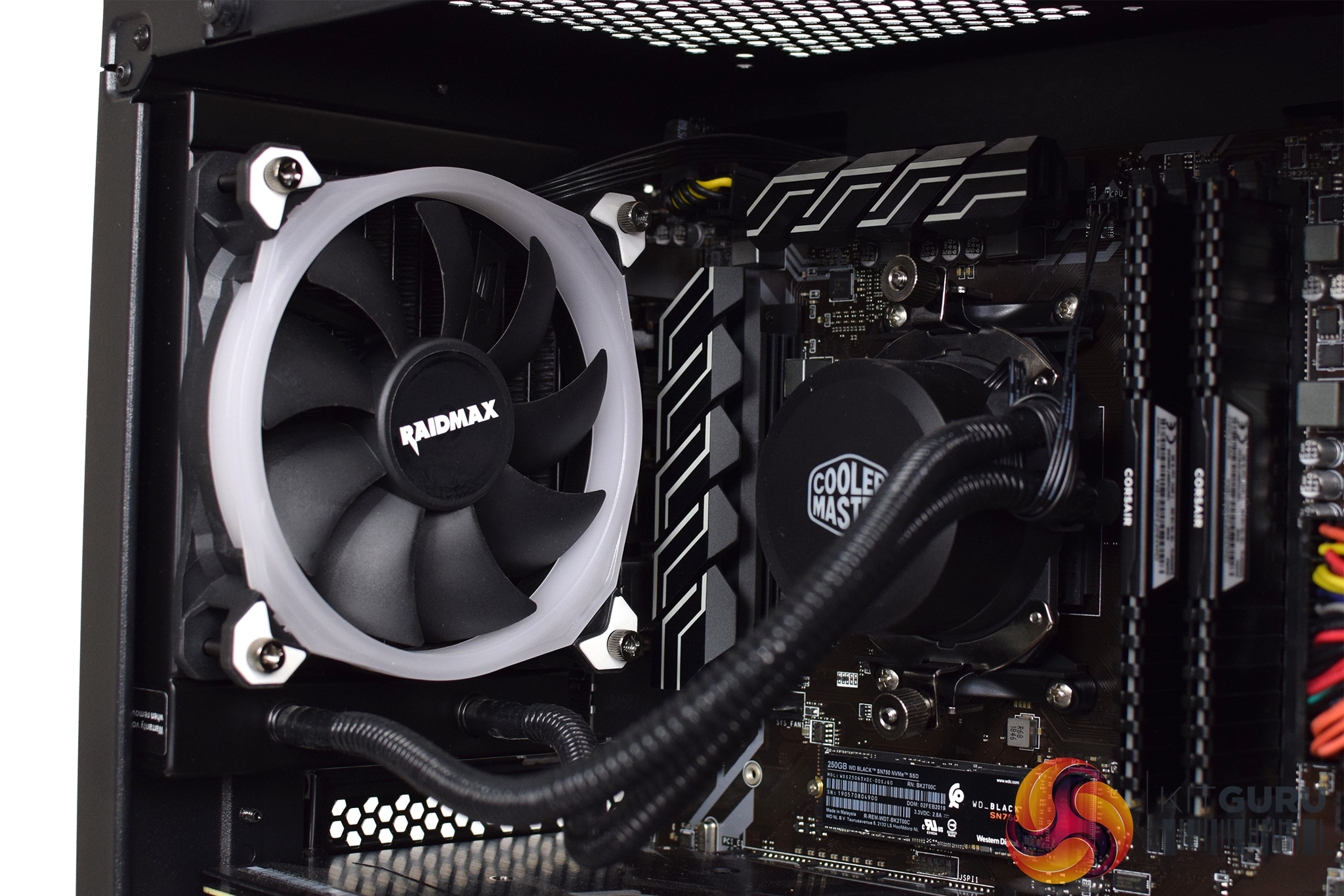 Alongside the CPU, we find 16GB of DDR4 memory. This specific kit is 2x8GB of Corsair LPX 2400MHz RAM, which struck me as a relatively slow speed to pair with Ryzen – the platform, as we know, scales well with faster memory. We look at this in more detail later in the review.
