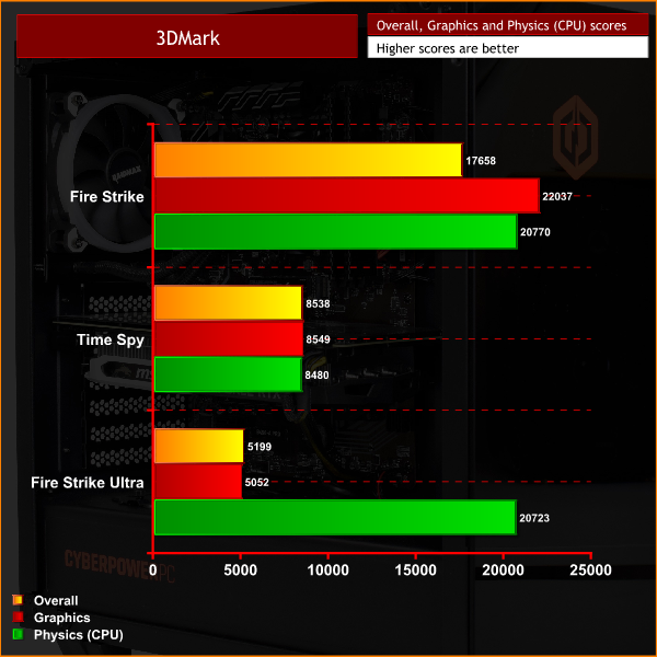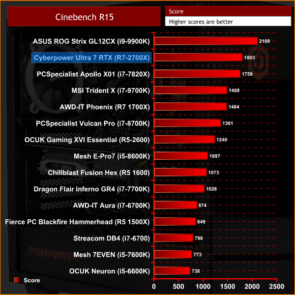 The Cyberpower Ultra 7 RTX performs pretty as much expected across the board. CPU performance is excellent thanks to the 8-core 16-thread Ryzen 7 2700X, as demonstrated by the Cinebench R15 and R20 results, while our 3DMark CPU/Physics scores are also very healthy. Bear in mind the CPU has not been overclocked, but thanks to AMD's XFR technology it was still running at 4GHz across all cores when under load.