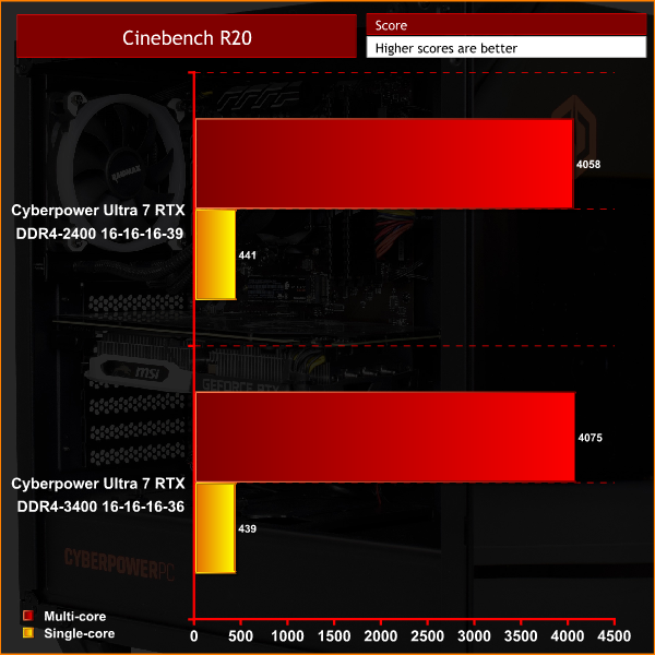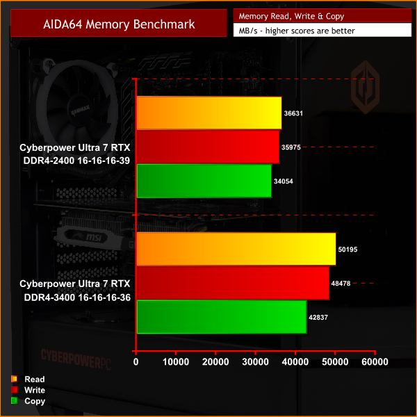 Starting with our AIDA64 memory benchmark, unsurprisingly the faster memory outstrips the 2400MHz kit in terms of read, write and copy speeds. Cinebench R15 and R20 show marginal improvements to using the faster memory, but it is the games testing I am most interested in.