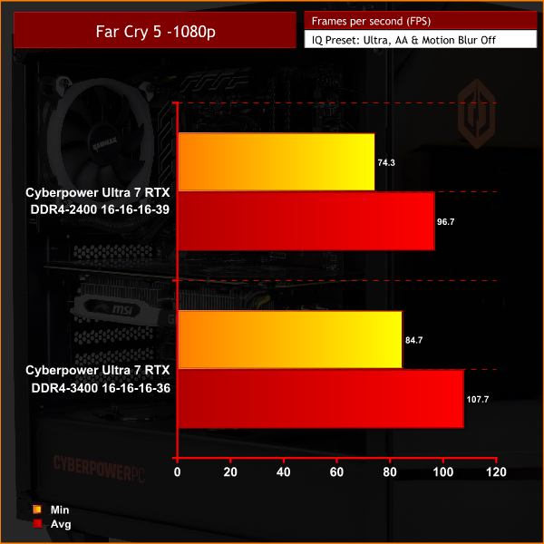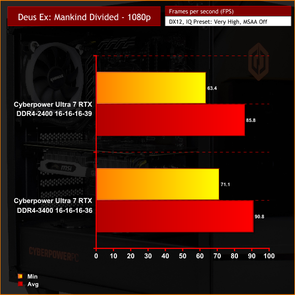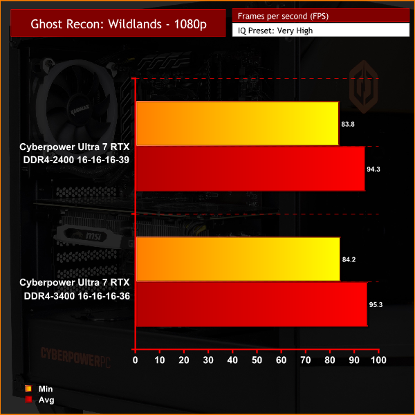 Here, we can see quite a difference when using the 3400MHz DDR4 kit – though it does depend on the game. Far Cry 5, for instance, is noticeably CPU-bound at 1080p, so the faster RAM helps our average frame rate increase by over 10 FPS – a very good improvement. In Deus Ex: Mankind Divided, average frame rate rose 5FPS, with minimum frame rates rising by almost 8FPS. Ghost Recon Wildlands is the odd one out, with the faster memory making little difference.