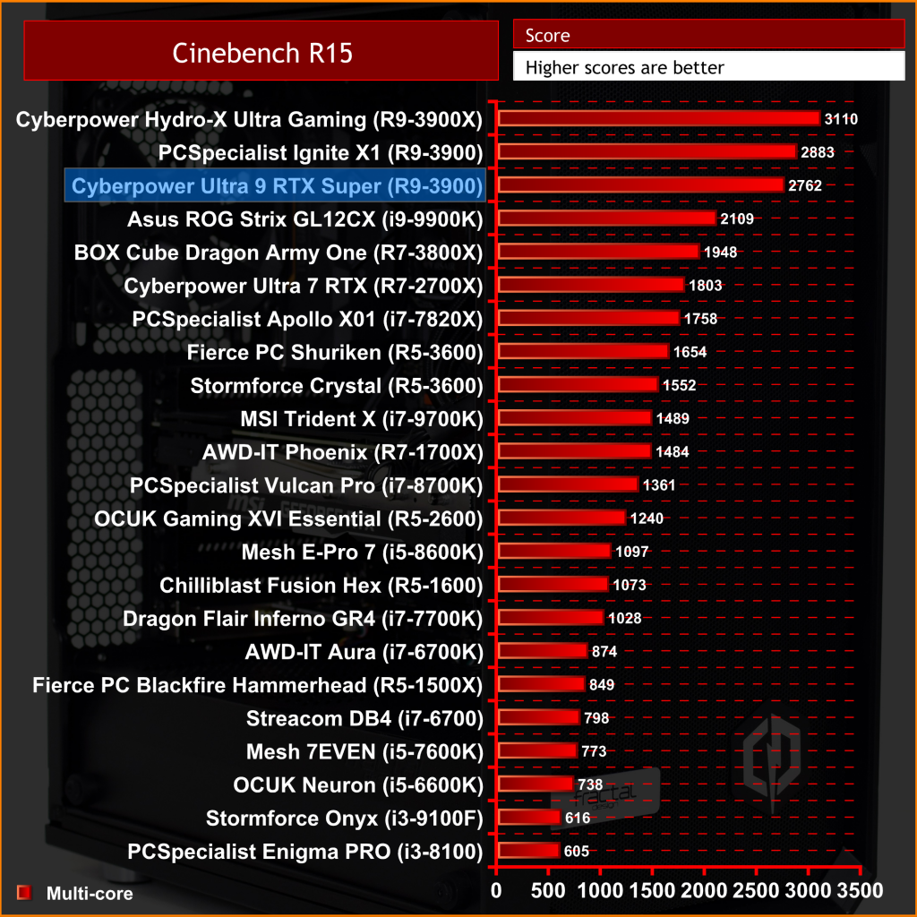 In terms of Cinebench scores, we can also observe a small difference between the two systems, with the Cyberpower producing multi-core scores which are 4 and 5% slower than the PCSpecialist system, for Cinebench R15 and R20, respectively. This isn't a huge difference by any means, but it is something.
