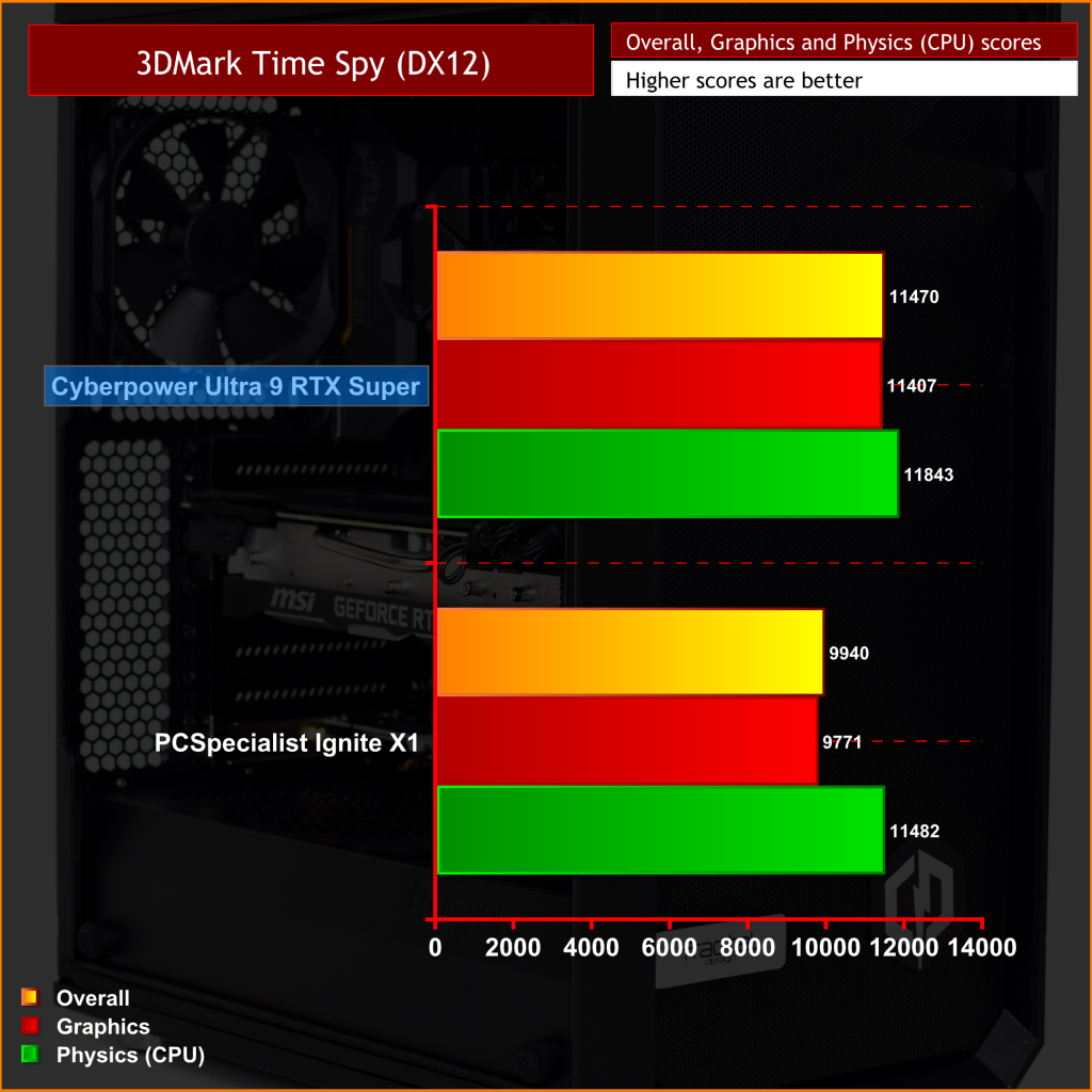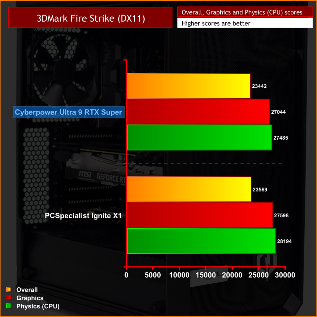 Diving into our 3DMark scores, here we have compared the Ultra 9 RTX Super with the PCSpecialist Ignite X1 which uses the same Ryzen 9 3900 CPU, but with an AMD RX 5700 XT graphics card. Despite this, the Fire Strike and Fire Strike Ultra tests do seem to favour AMD hardware in the graphics department, as the scores are marginally higher for the PCSpecialist system. However, there is much more of a noticeable difference in Time Spy, where the Cyberpower's overall score is 15% higher than the PCSpecialist.