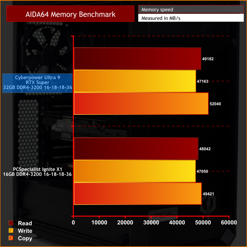 Moving onto testing the rest of the system, AIDA64's memory benchmark shows strong results, with the Cyberpower out-doing the PCSpecialist Ignite in terms of the DDR4 read, write and copy results – though do bear in mind the Cyberpower has twice the RAM capacity.
