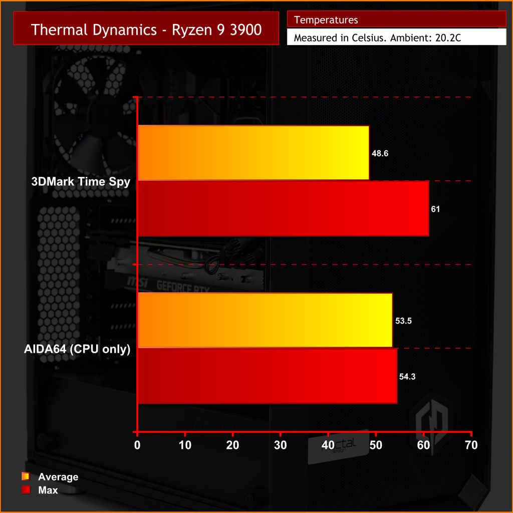 Looking now at our thermal testing, if we start with the CPU we can see that, regardless of whether we were running our AIDA64 stress test or 3DMark Time Spy, CPU thermals were very impressive. After all, this is a 65W TDP CPU being cooled by a 240mm AIO liquid cooler. The hottest we saw the CPU run was a spike up to 61C during Time Spy, but that was very momentary as the temperature averaged under 50C for the duration of the test. Even being pummelled in AIDA64 at 100%, temperatures didn't reach 55C.