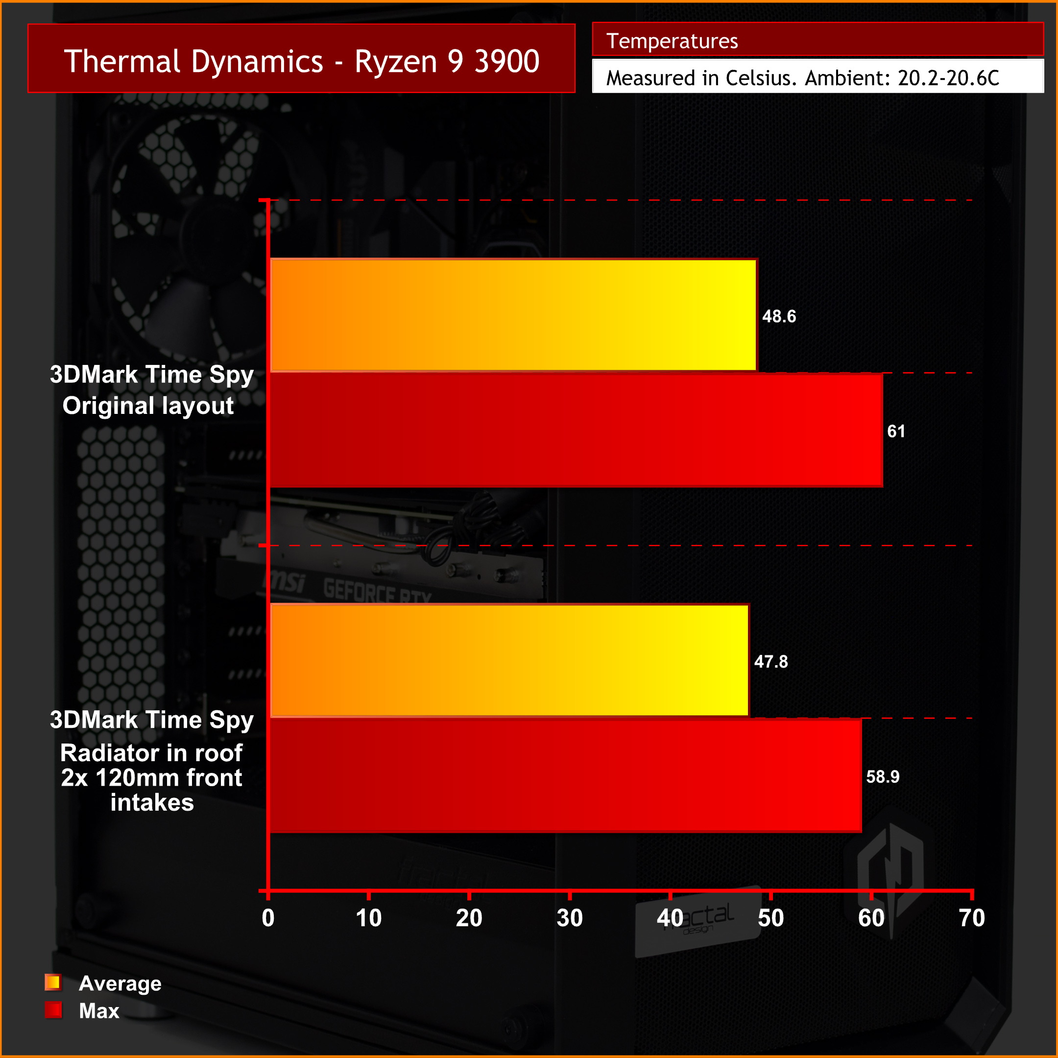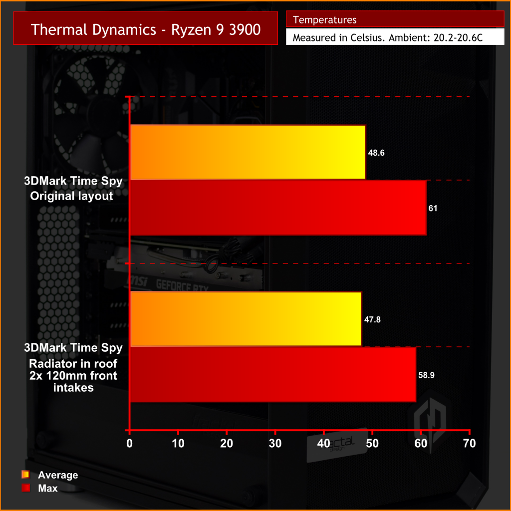 …and the difference is remarkable. Not so much for the CPU as that was already very cool-running, but the GPU saw a huge drop in temperature – 14C in regards to peak temperature, and over 11C when looking at average temperature for the duration of the 3DMark stress test.