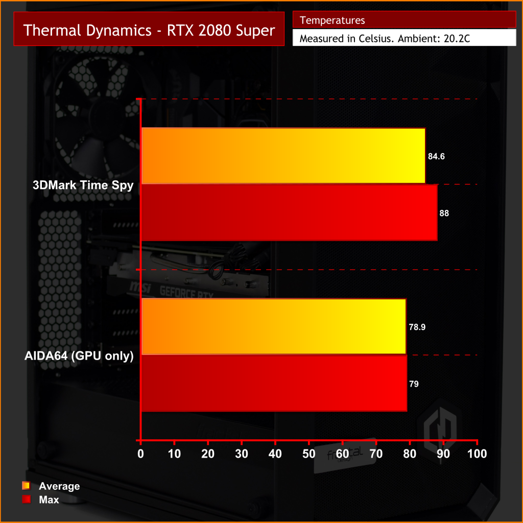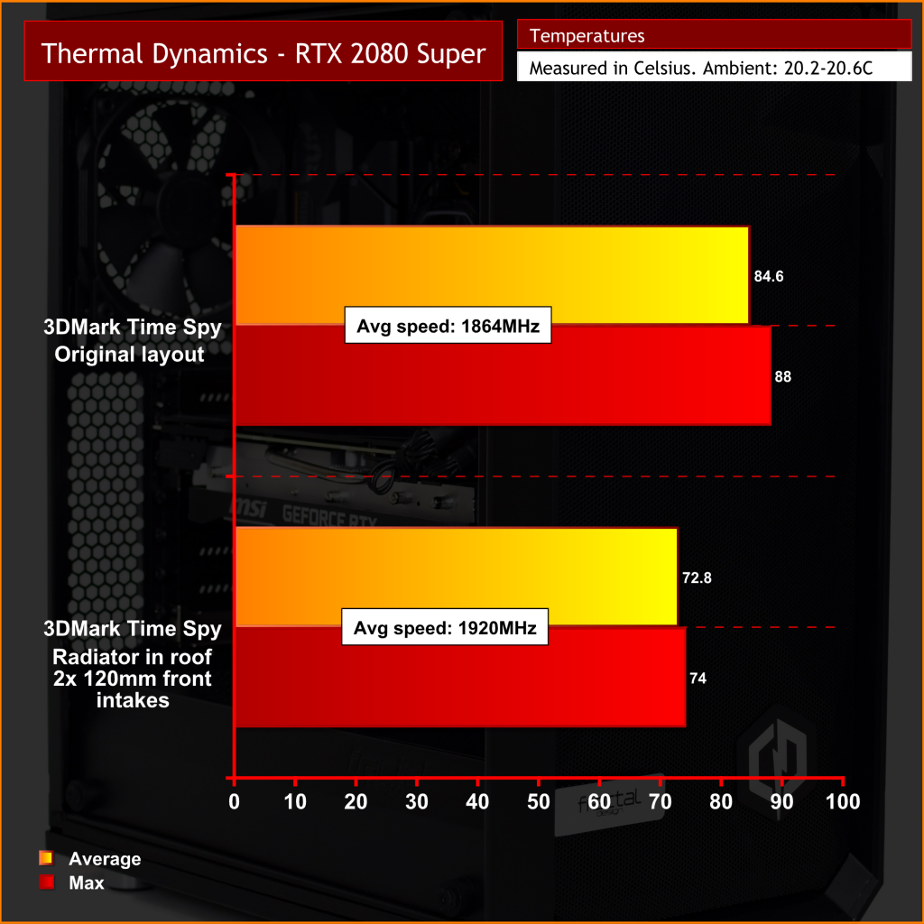 Not only is that now well below the temperature target of the graphics card, but it also allows the card to run faster. To prove this, average clock speed of the 2080 Super with the radiator at the front of the case was just over 1860MHz. Moving the radiator to the top, and adding two intakes, allowed the GPU core to run almost 60MHz faster.