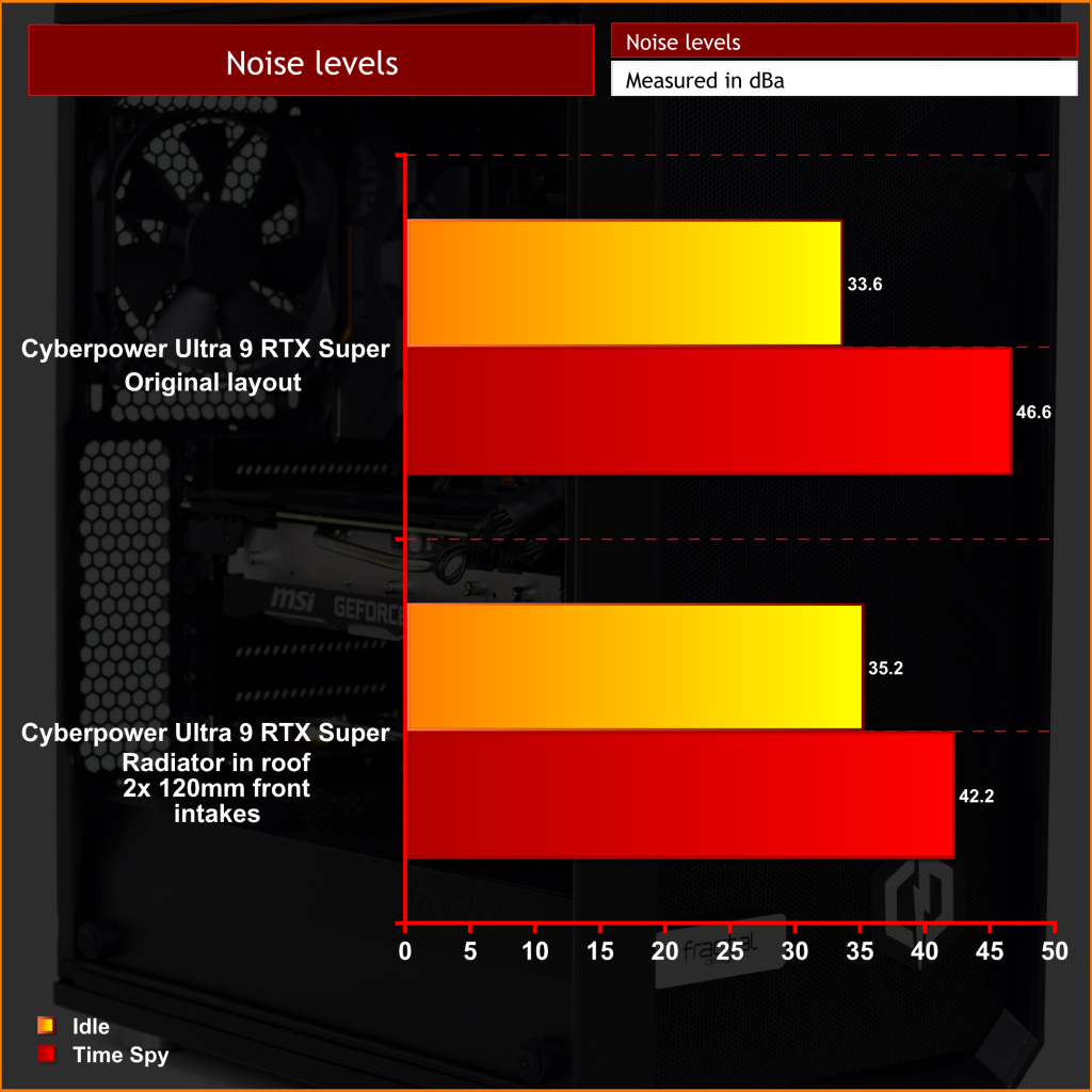 Not only are temperatures greatly improved, but overall noise is noticeably lessened with this updated configuration. The primary reason being for this is the GPU fans can spin significantly slower while still maintaining lower temperatures. Proving this, in the default configuration GPU fan speed would ramp up to 93%, or around 3150rpm. With our updated configuration, however, fan speed dropped to 65%, or just over 2200rpm. It makes a massive difference.