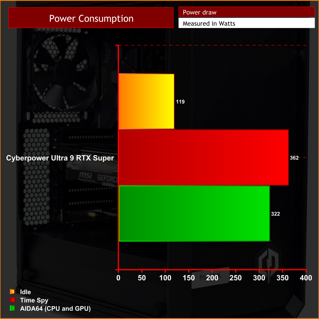 Lastly we come to power consumption. With a 750W RM 80+ Gold rated PSU from Corsair, the Ultra 9 RTX Super draws less than half of the power supply's rated wattage. This ensures strong efficiency levels and also means there is plenty of headroom for upgrading down the line – perhaps users might want to drop in a next-gen Ryzen part with 16+ cores, or upgrade the graphics – there is certainly scope to do that here.
