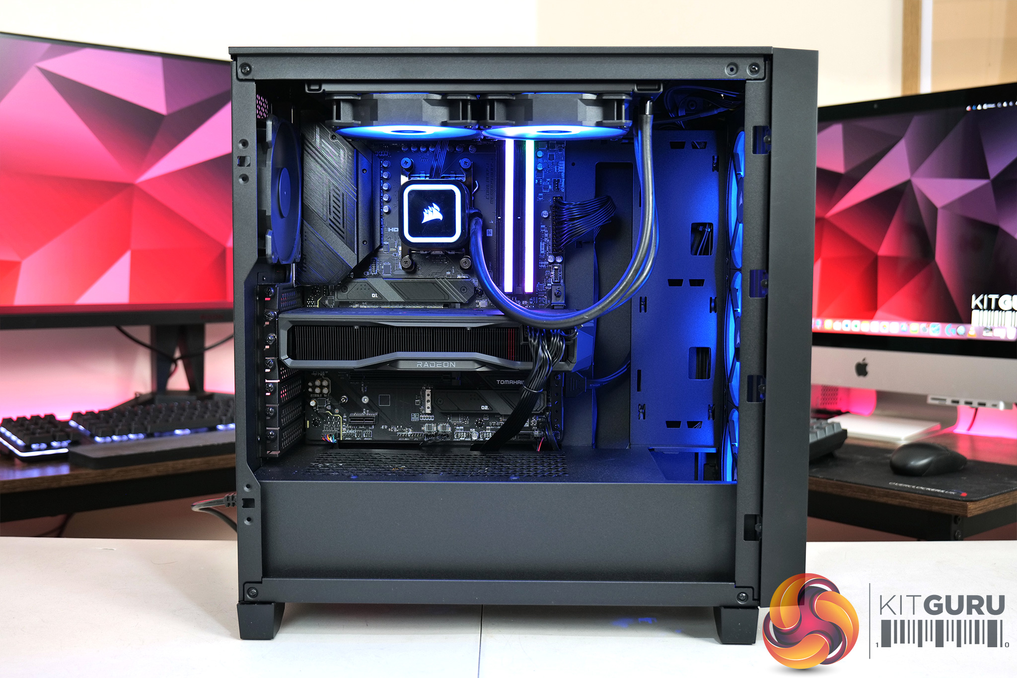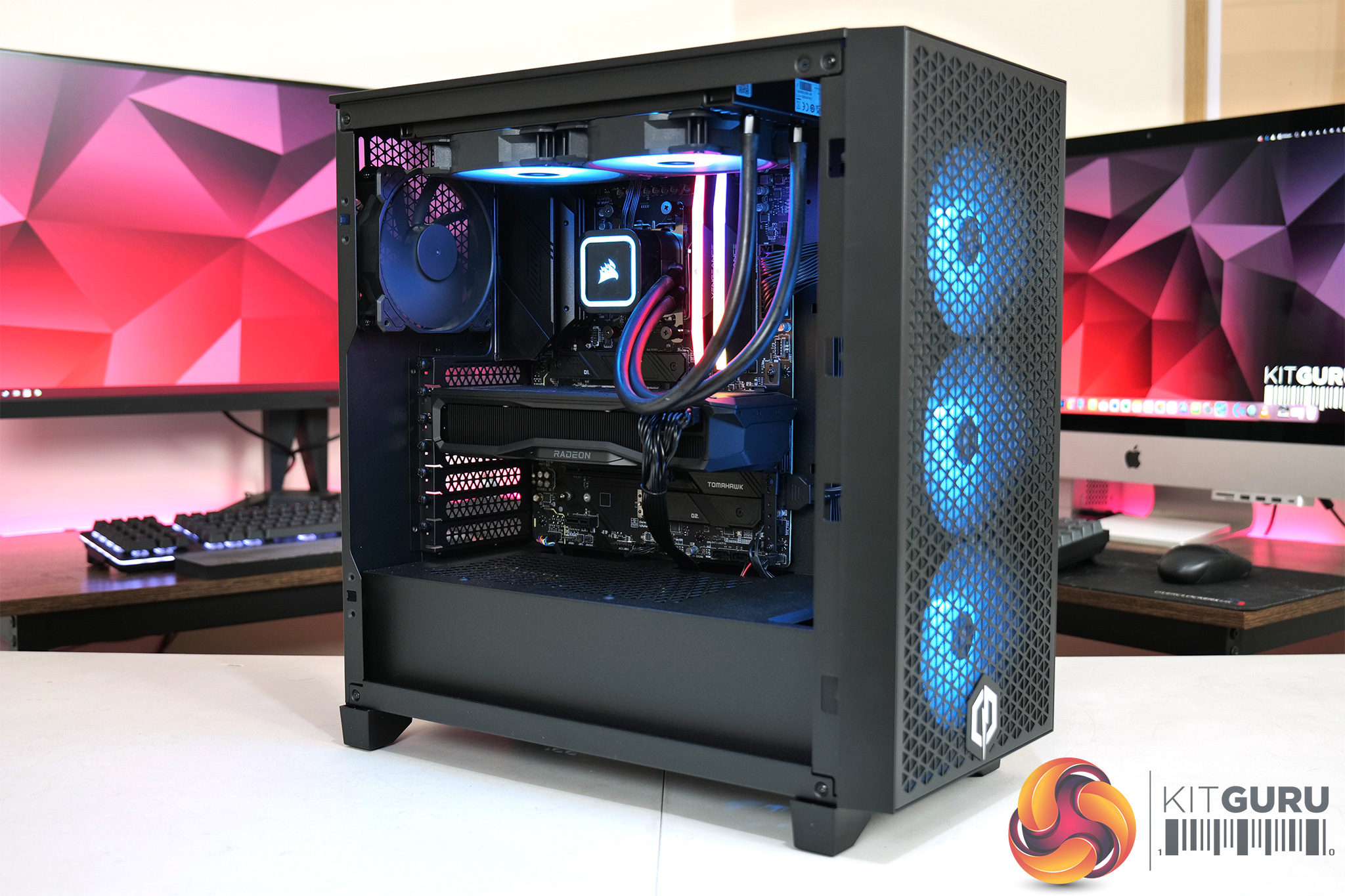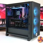 Taking a closer look at the system, we start with the chassis, where Cyberpower has opted for the Corsair 3000D RGB Airflow. We've not reviewed this model but it is popular with system integrators, offering a compact mid-tower design. It's not a particularly feature-rich case but you get a mesh front panel, tempered glass side panel as well as three pre-installed 120mm RGB fans acting as intakes at the front. Cyberpower has added a plain black 120mm to the rear of the case, acting as an exhaust, while the two fans on the radiator are also exhausting out of the roof.