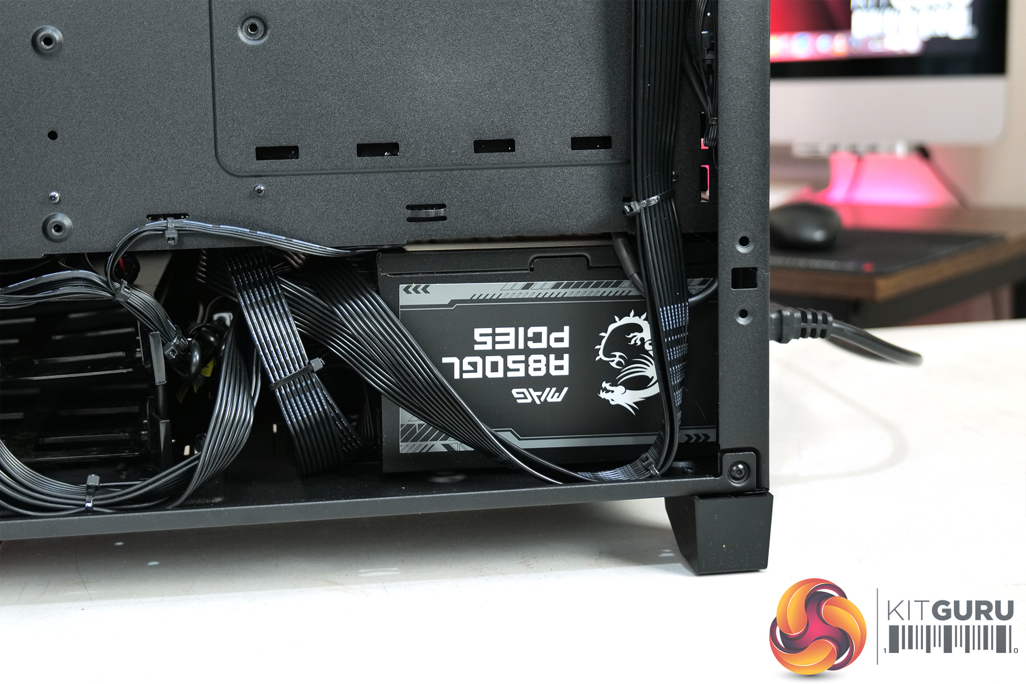 Switching to the back of the case, we can get a look at the power supply, MSI's MAG A850GL PCIe 5.0. We've not reviewed this one, on paper it looks fine offering 850W capacity and 80 Plus Gold certification. The ‘PCIe 5.0' part of the name just means it does support a 12VHPWR connector, which we don't need for the 7900 GRE, but the cable still comes included if you upgraded the GPU down the line.