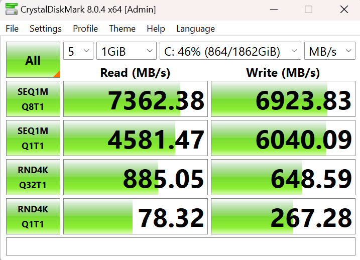 Lastly, the 2TB Kingston Fury Renegade delivers performance about where we'd expect for a premium Gen4 drive. Reads are just over 7.3 GB/s, while writes are a touch below 7 GB/s.