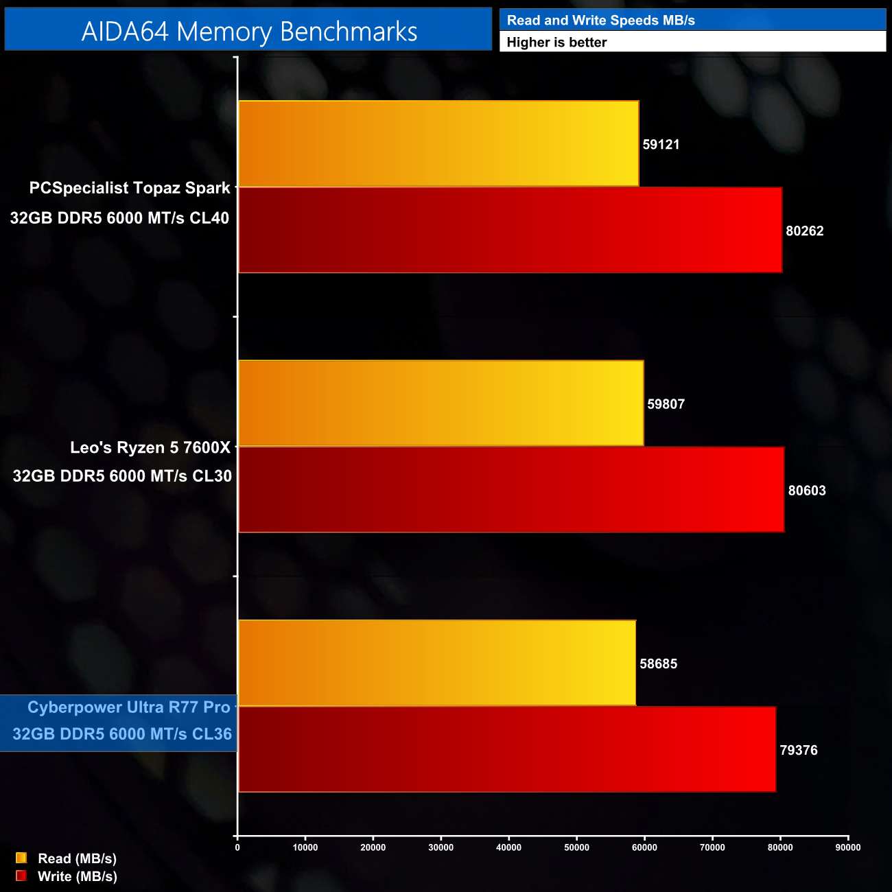 Memory benchmarks follow a similar trend. All three kits shown are DDR5 6000 MT/s memory modules and all produced very similar performance, with reads around 59000 MB/s and writes at or around 80000 MB/s.