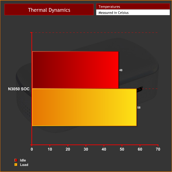While idling at 48 Celsius is fairly warm for a CPU that is not really doing anything, peaking at 58 Celsius is a good result for this passively cooled PC. Temperatures are certainly not a problem.