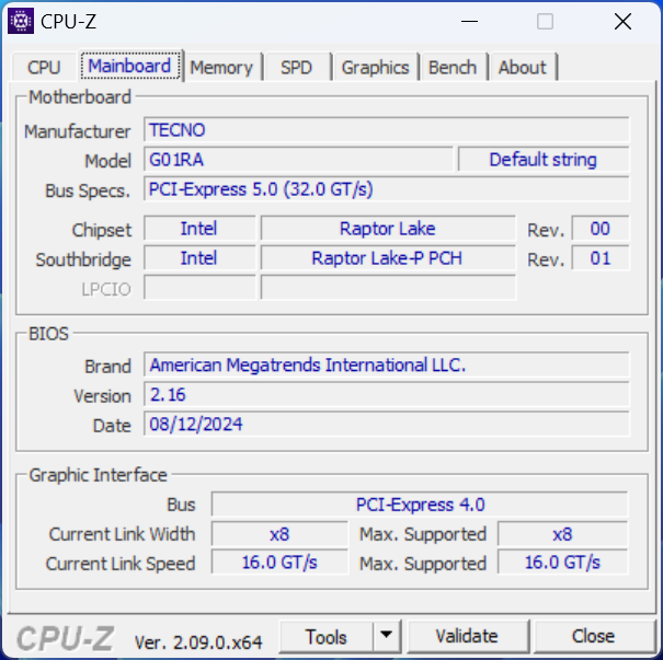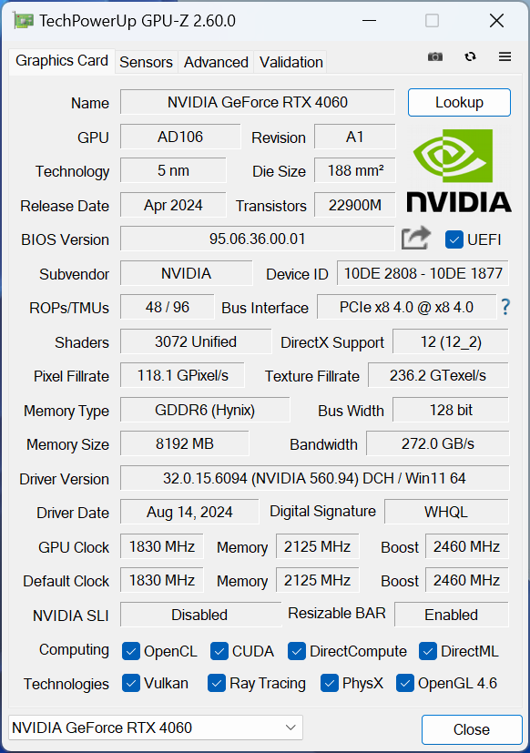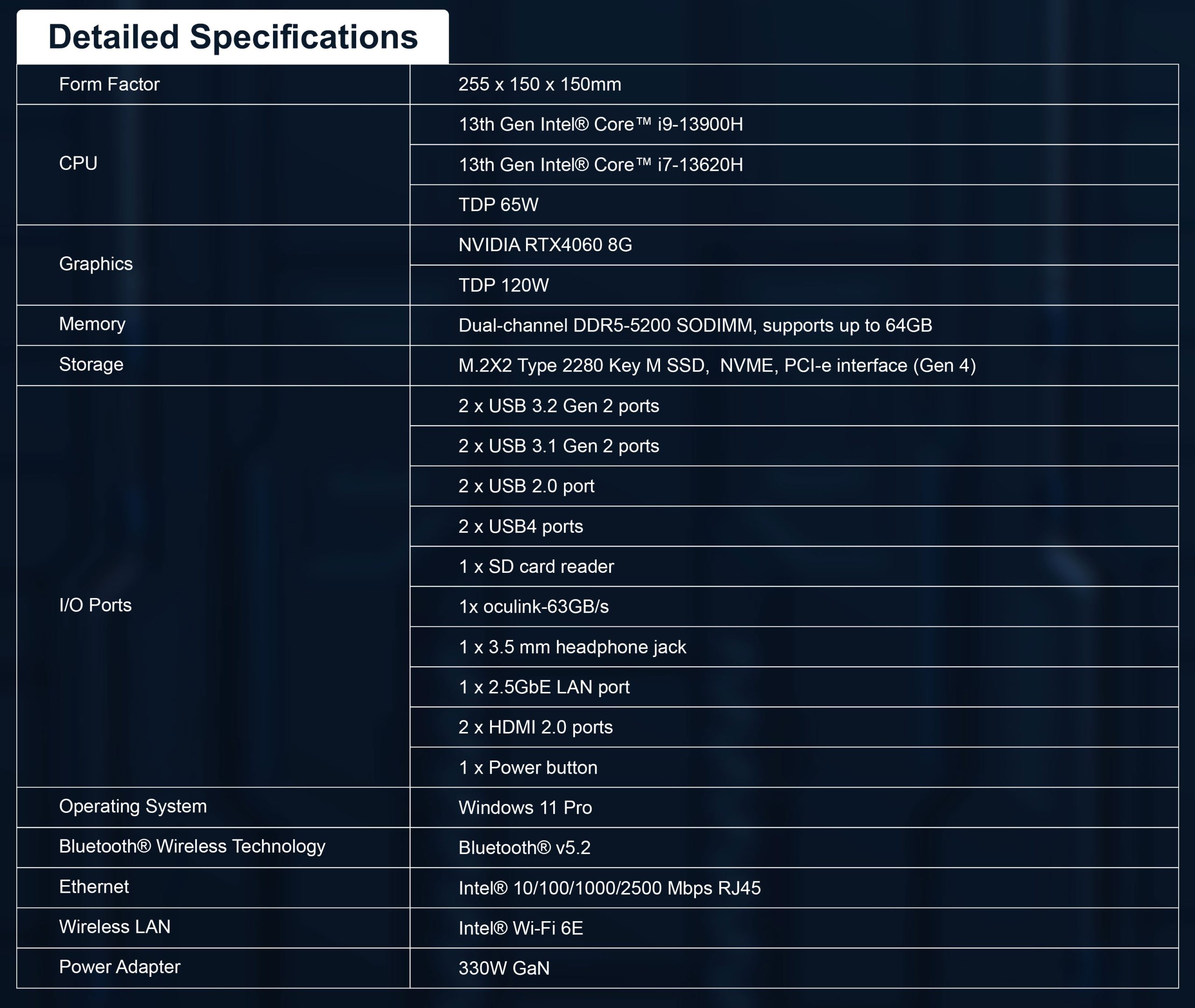 Confirm the core spec of the machine, the Megamini G1 is using an Intel Core i9-13900H Raptor Lake CPU, and obviously that is a mobile part with six P-cores and eight E-cores. It's also now a last-gen SKU, I did ask Geekom why they opted for an older CPU and they told me it basically came down to what was available when they started the project, though there was a suggestion a 14th Gen model may be coming, but for now this it it. Memory is provided by 2x 16GB DDR5-5200 modules, CL42. The GPU is an RTX 4060, running at stock clocks (2460MHz boost.)