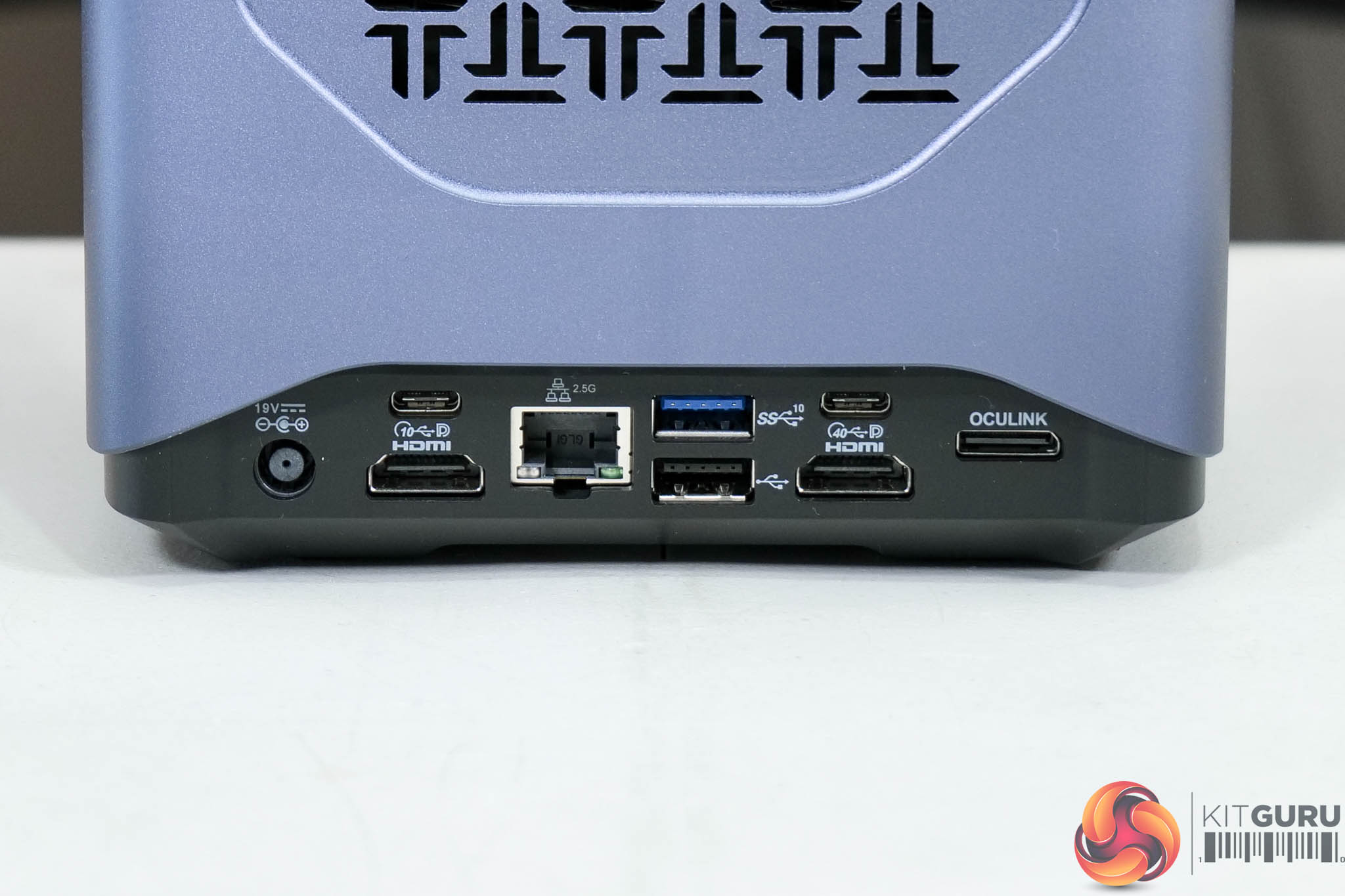 Round the back we find plenty of ventilation cut-outs in the metal, as this is where the AIO fan exhausts hot air, and there's the rear I/O panel at the bottom. To Geekom's credit it is a very full I/O with plenty of USB ports – as well as four more round the front -alongside 2x USB 4 Type-C ports, Ethernet, and even an Oculink which Geekom claims can offer 63GB/s bandwidth and could be a way to connect a faster external graphics card down the line. My main disappointment here is that the HDMI ports are 2.0 and not 2.1, despite HDMI 2.1 being supported by the RTX 4060 GPU. I personally wanted to try hooking this up to my LG OLED TV which can do 4K/120, but sadly you will be limited to 60Hz in this scenario.