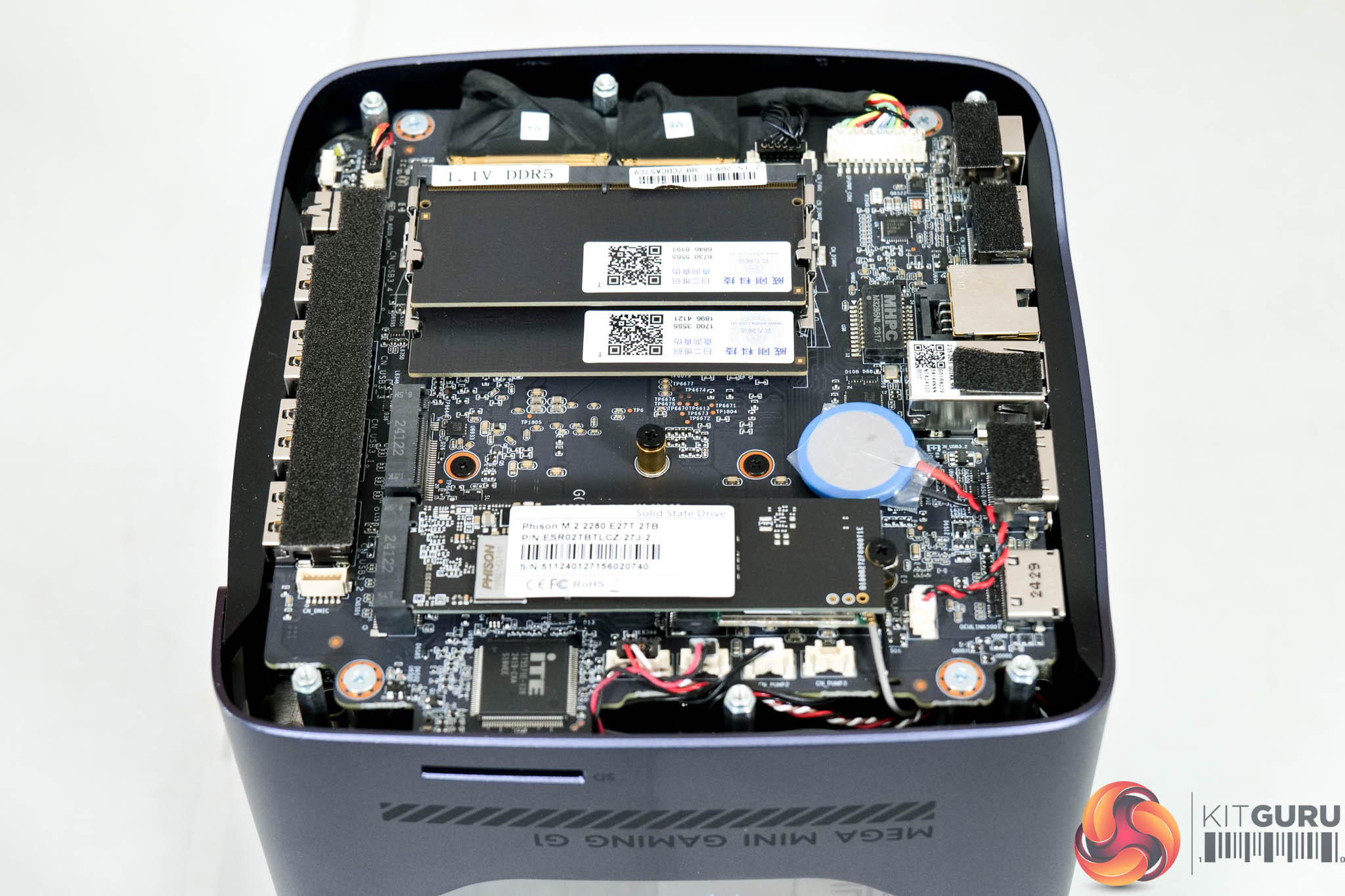 As for disassembly, this is done in parts and initially seemed fairly straightforward. You first remove four rubber feet from the underside of the machine to reveal the four screws holding the bottom panel in place. That pops off and there's a couple more support brackets to remove, before you get access to the underside of the motherboard. Here we can access the two SODIMM slots, each occupied by a 16GB module, while there's also one 2TB Phison E27T M.2 SSD installed and a spare M.2 slot next to it, though it is limited to 2242 drives and not fullsize 2280 models.