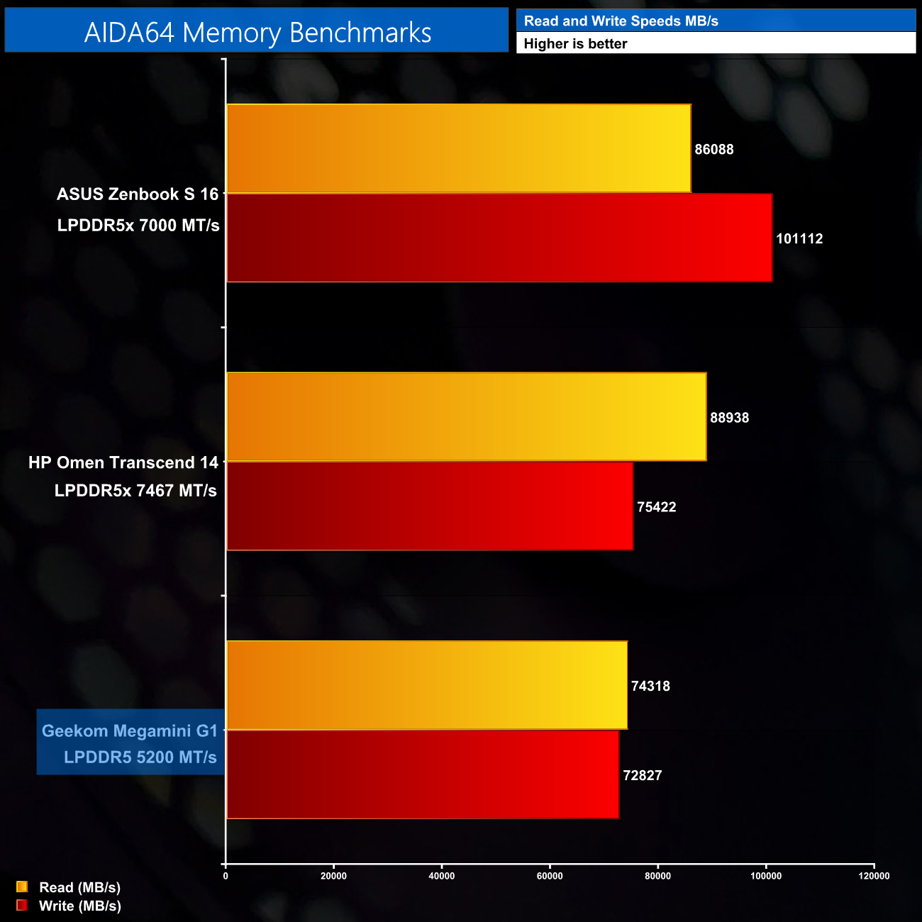 By sticking with Raptor Lake however, and the relatively slow memory limitations that come with the platform compared to newer systems, the Megamini G1 doesn't offer the fastest memory speeds, with read and writes just over 70,000 MB/s. LPDDR5x systems can get closer to 90,000 – even 100,000 MB/s.