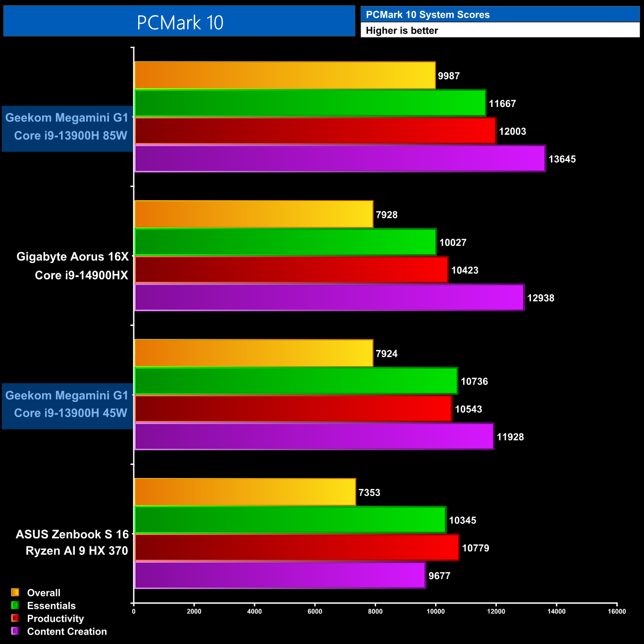 PCMark 10 results are again about as expected, though the Performance mode does make a sizeable difference – bumping up the overall score by 26% in this instance.