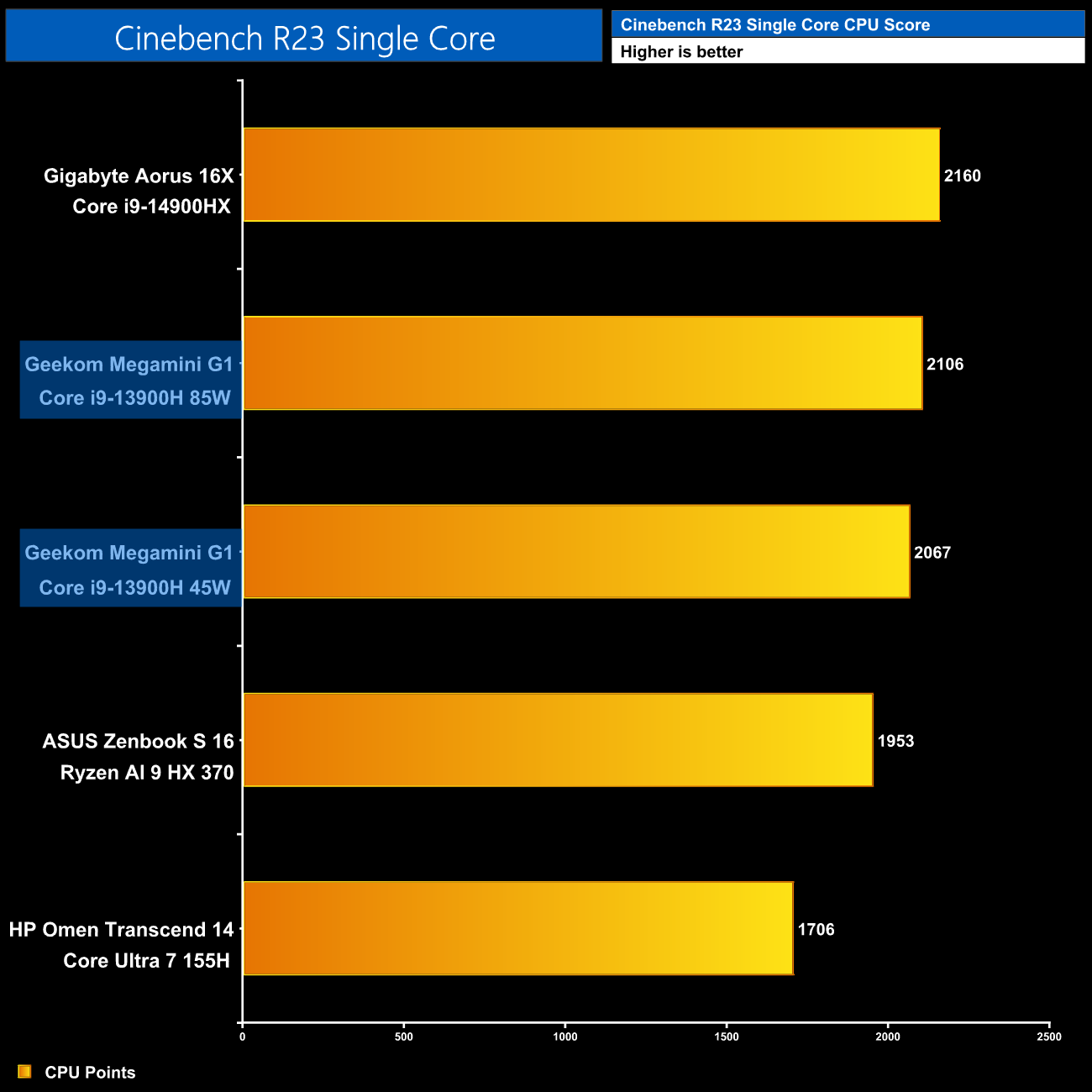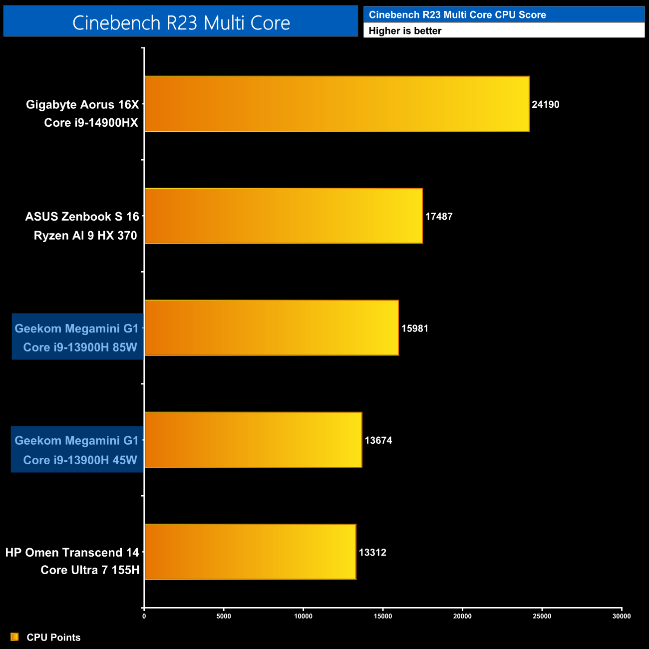 Starting off with Cinebench R23 multi core, we can see a difference in performance between the two modes on offer, with the Performance profile delivering an extra 16% over the Normal mode. Both results are relatively slow by modern standards, particularly in comparison to Intel's currently mobile flagship CPU, the 14900HX.