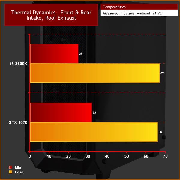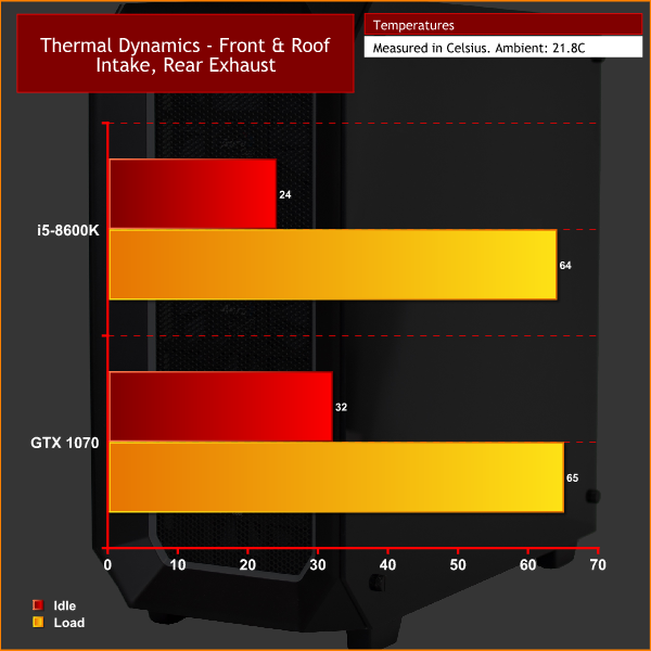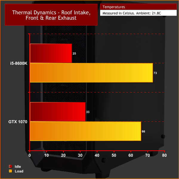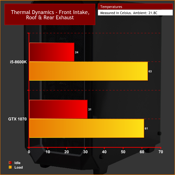 Lastly, we were again told something different, with the final configuration consisting of the three front fans set to intake, with the rear fan also set to intake, with two fans in the roof set to exhaust.