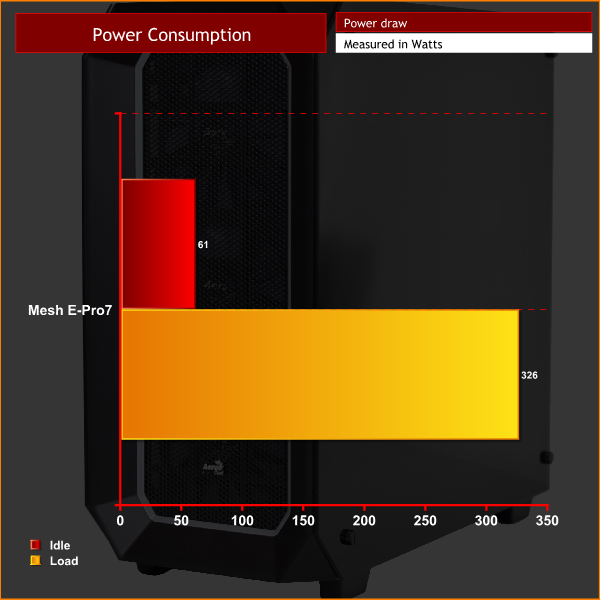 Elsewhere, power consumption is also nothing to worry about, though it does make me question the use of the 850W Aerocool PSU. Typically we would say you want the total system power draw to be between 40-70% of a PSU's rated capacity, and with the E-Pro7, the figure is 38.4% – so not far off. However, if Mesh had used the 650W model – still 80+ Platinum – the system power consumption would still only be 50.1% of the PSU's rated capacity, so still in the optimal ‘zone', but you'd save £30 in the process according to street pricing.