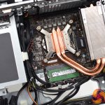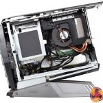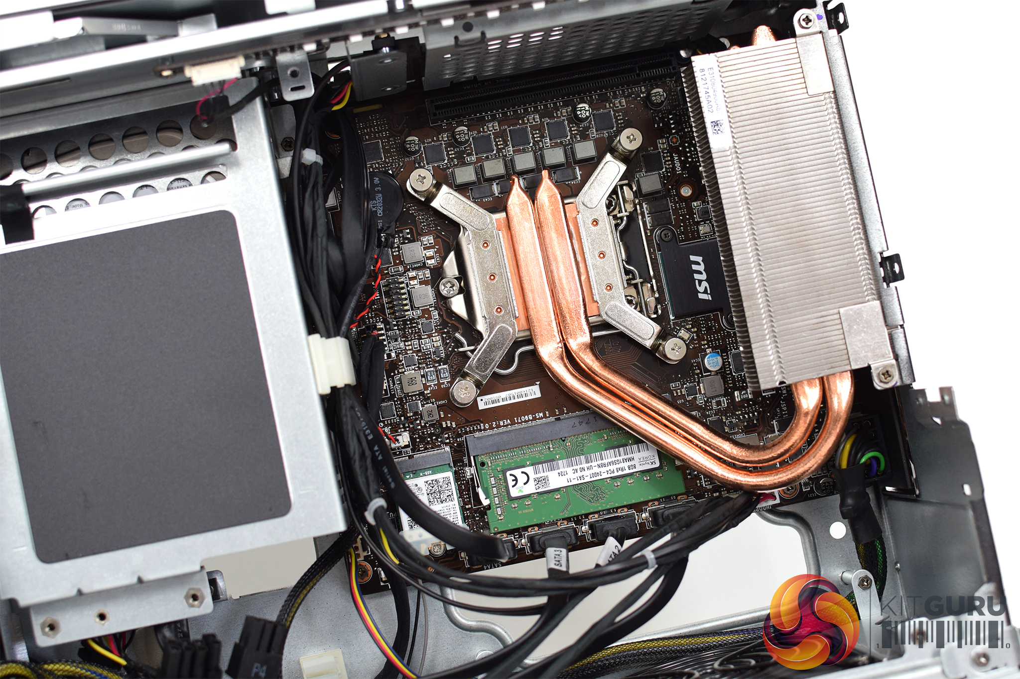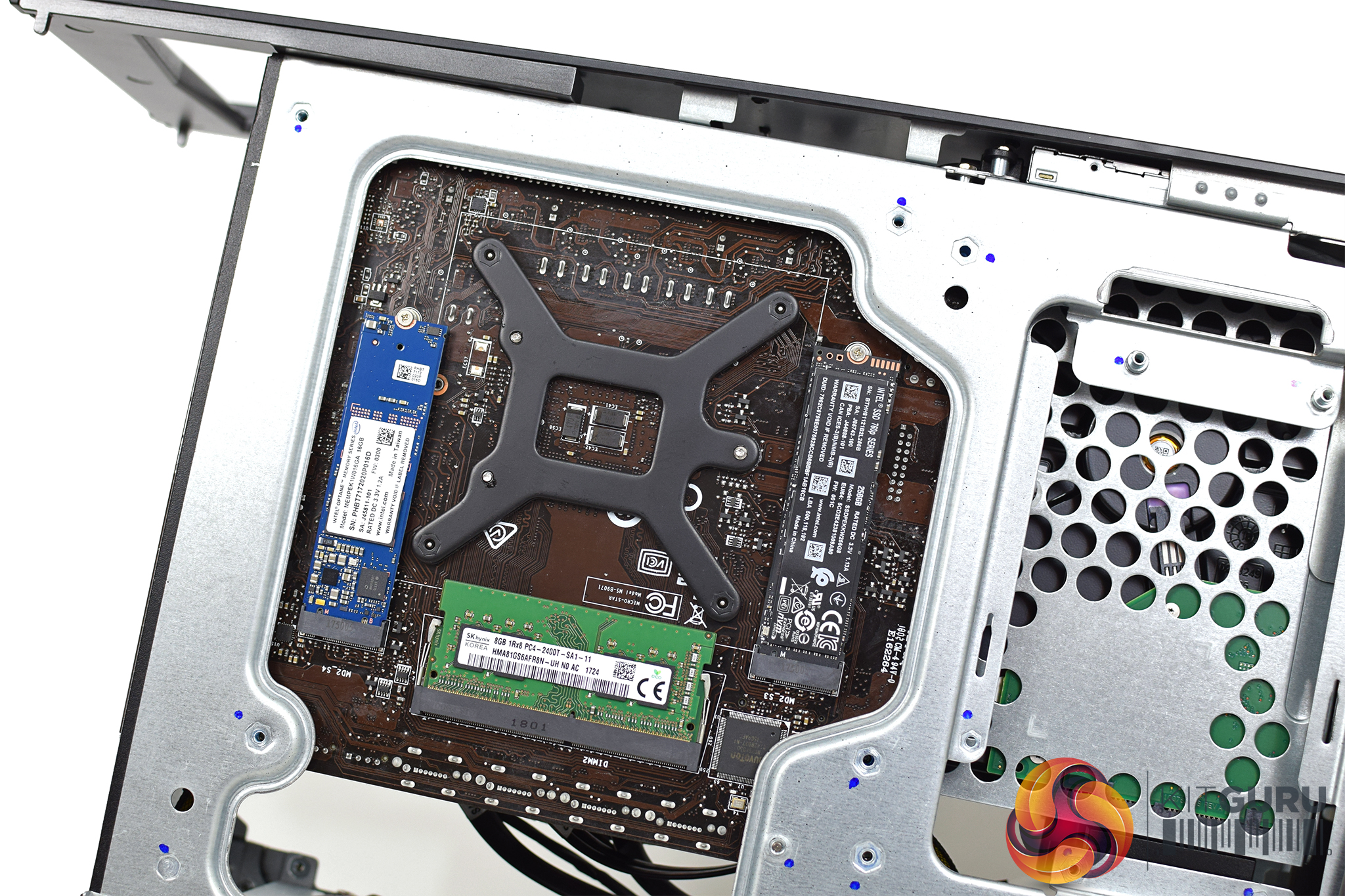 Removing that plastic frame is ‘only' a case of taking out five more screws, and at last we can get a look at the ITX motherboard and the rather measly-looking cooling solution for the i7-8700. Underneath that, it is interesting to note a single 8GB DDR4 SODIMM module that runs at 2400MHz.