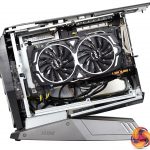 Opening the side panel reveals a GTX 1070 Ti that is not only mounted vertically, but is also upside-down, and at first you may think that's as far as you can go. Several screws (and several minutes of jiggling) later, you will eventually manage to remove the graphics card. With that out of the way, we get a look at the small laptop-style fan that cools the CPU's heatpipes, and that is actually part of the same plastic frame that houses a PCIe riser card for the GPU.