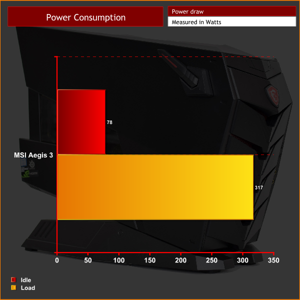Actual power consumption is not high – 317W for the whole system under 100% load. This means the 450W unit is only working at around 70% load.