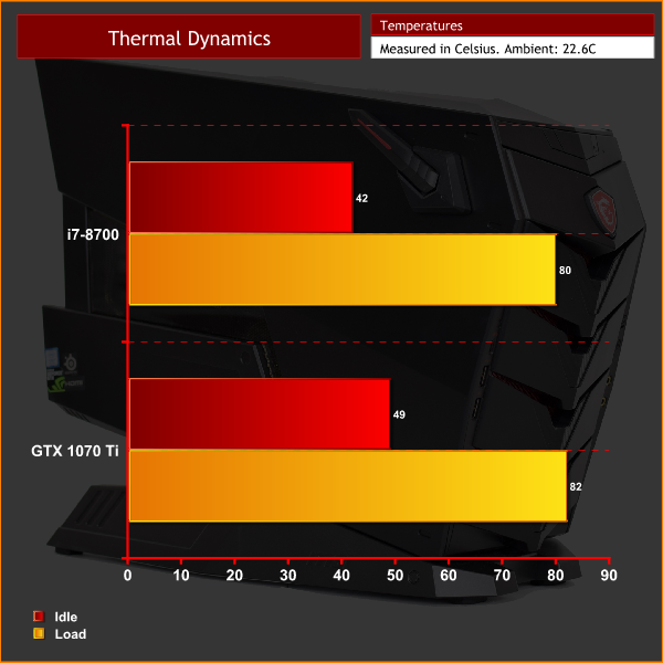 As you can see, thermal results are fine. Both CPU and GPU do idle relatively warm but it is nothing to be concerned about. The components peaked at 80C and 82C respectively, which is not super-cool, but we are still a long way from from the danger zone.