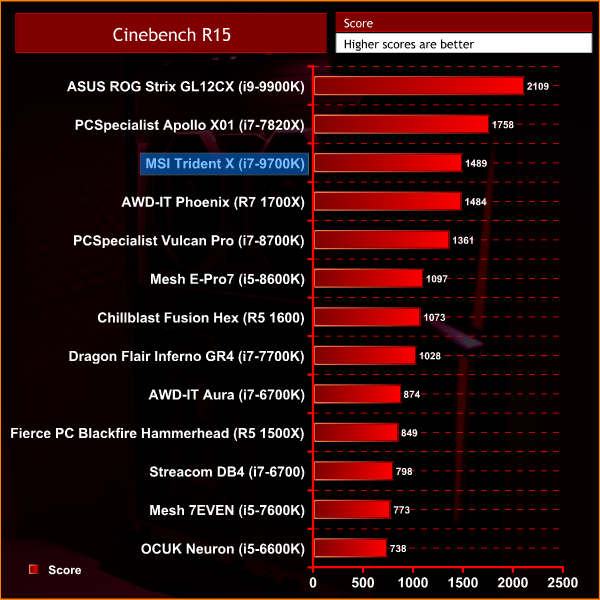 You do see the performance hit when running CPU-only tasks like Cinebench, as the 9700K scores about 600 points less than the 9900K. It is also worth mentioning that the 9700K used with the Trident X has not been overclocked, so out of the box it runs with an all-core turbo speed of 4.6GHz.