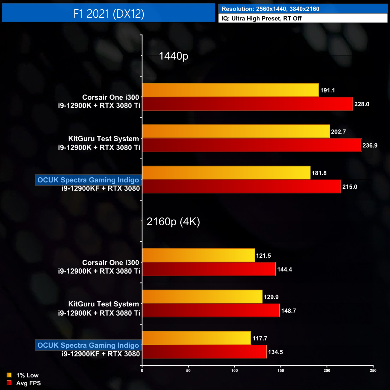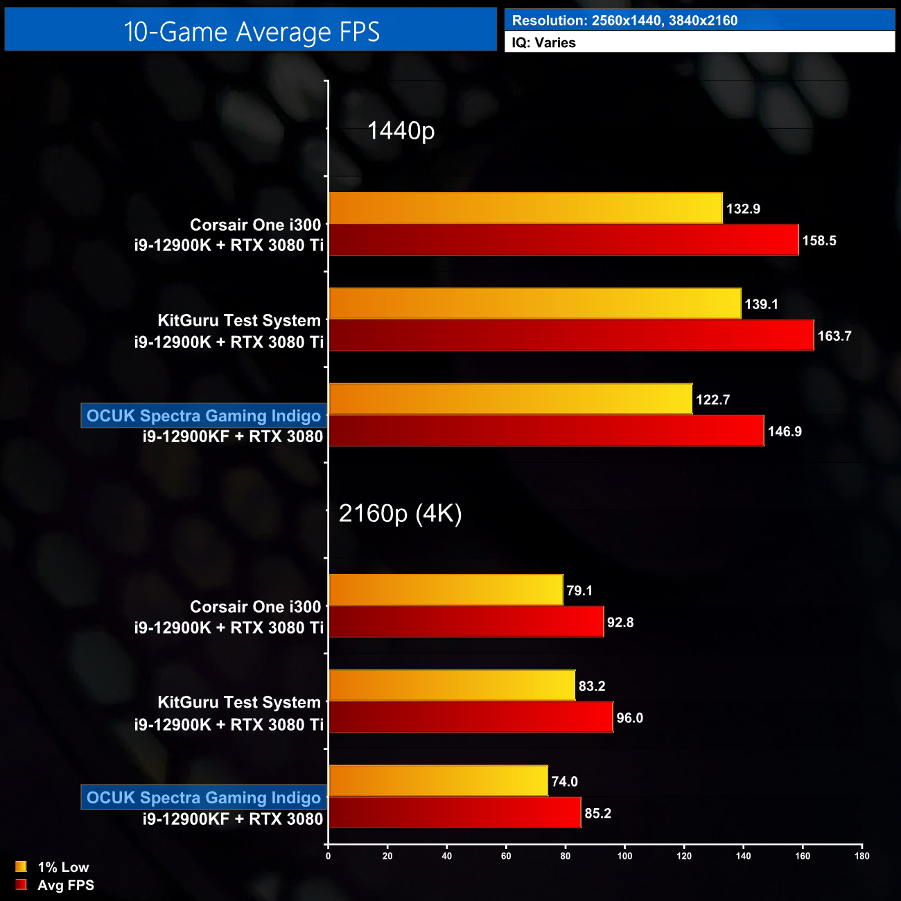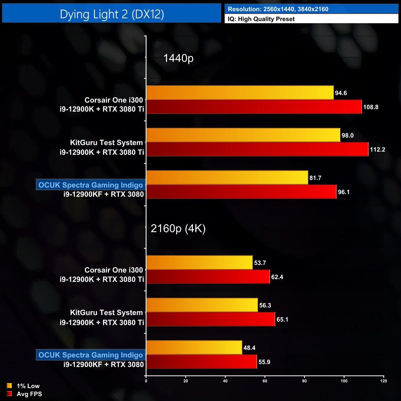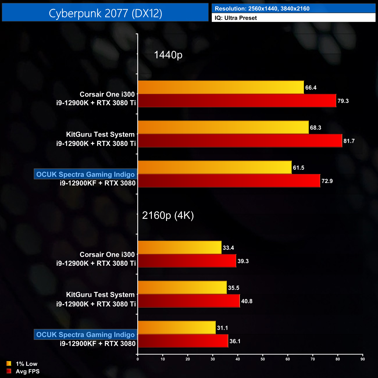 As expected, the RTX 3080 in the Indigo does reducing gaming performance by a touch compared to the other two systems, as they both have RTX 3080 Tis, but the differences are not big at all. Typically we see the Indigo coming in between 8-12% slower than the KitGuru Test System, but that still makes it a great system for high refresh 1440p gaming, and 4K is no problem too. You might not get a locked 60FPS in every title at 4K, as shown by the likes of Cyberpunk or Dying Light 2, but in plenty of other titles the frame rate is right up there.