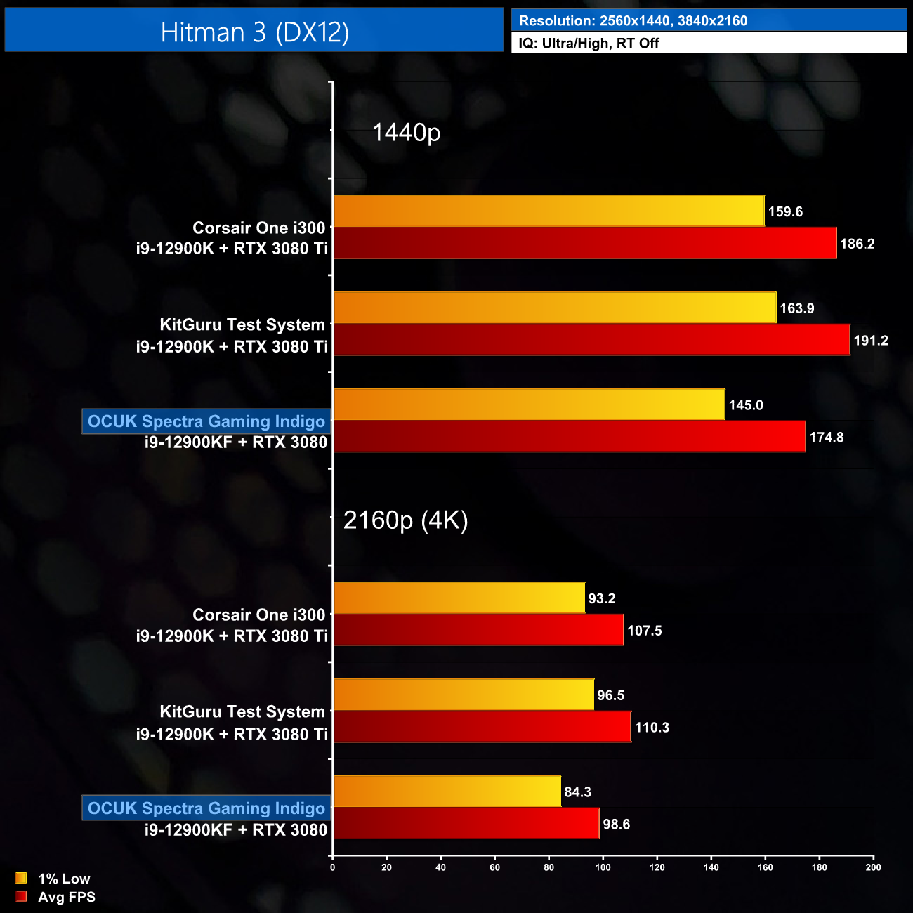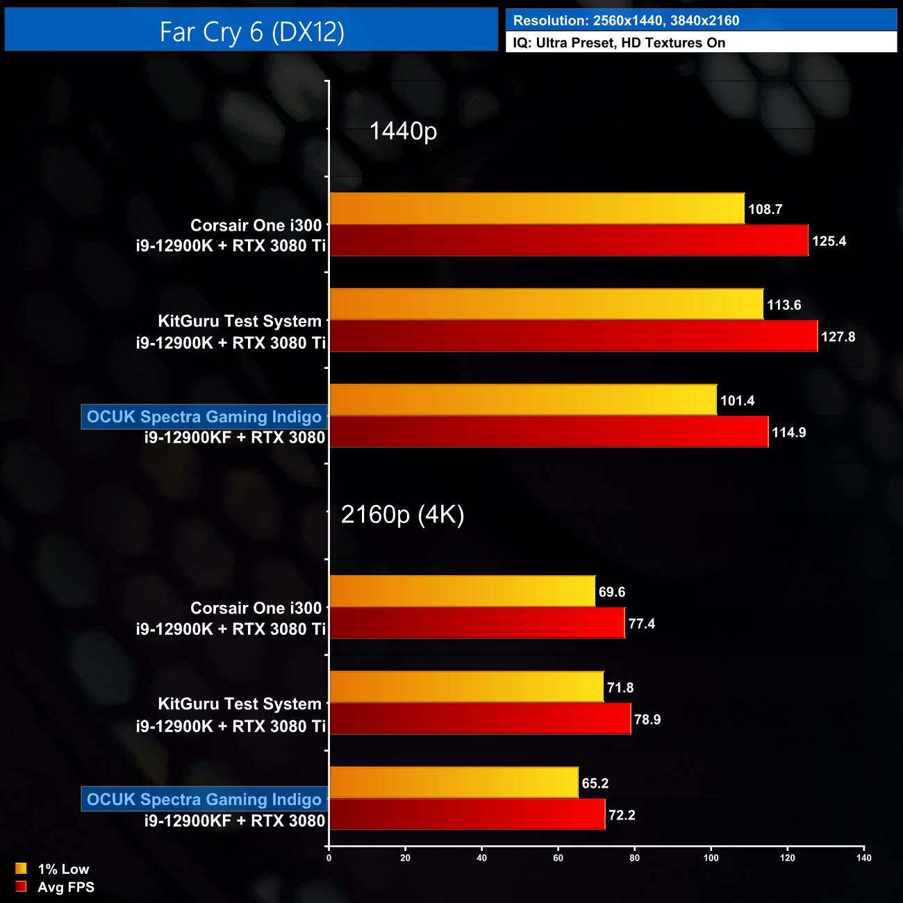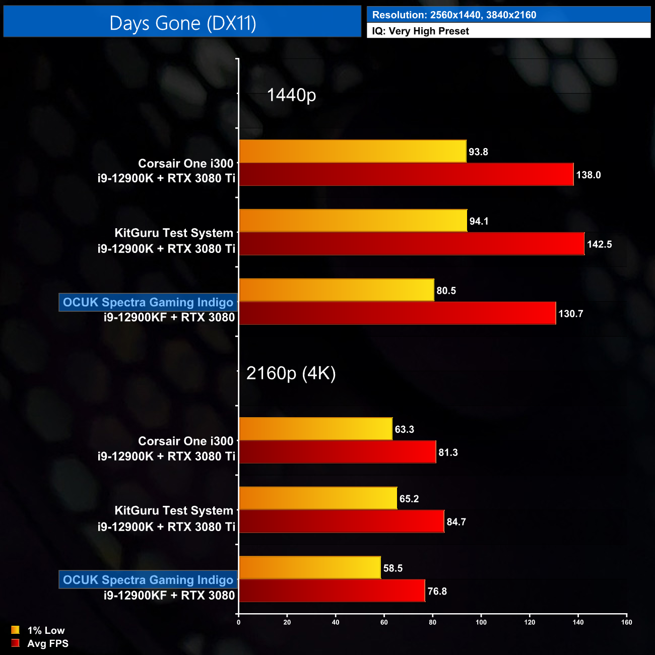 As expected, the RTX 3080 in the Indigo does reducing gaming performance by a touch compared to the other two systems, as they both have RTX 3080 Tis, but the differences are not big at all. Typically we see the Indigo coming in between 8-12% slower than the KitGuru Test System, but that still makes it a great system for high refresh 1440p gaming, and 4K is no problem too. You might not get a locked 60FPS in every title at 4K, as shown by the likes of Cyberpunk or Dying Light 2, but in plenty of other titles the frame rate is right up there.