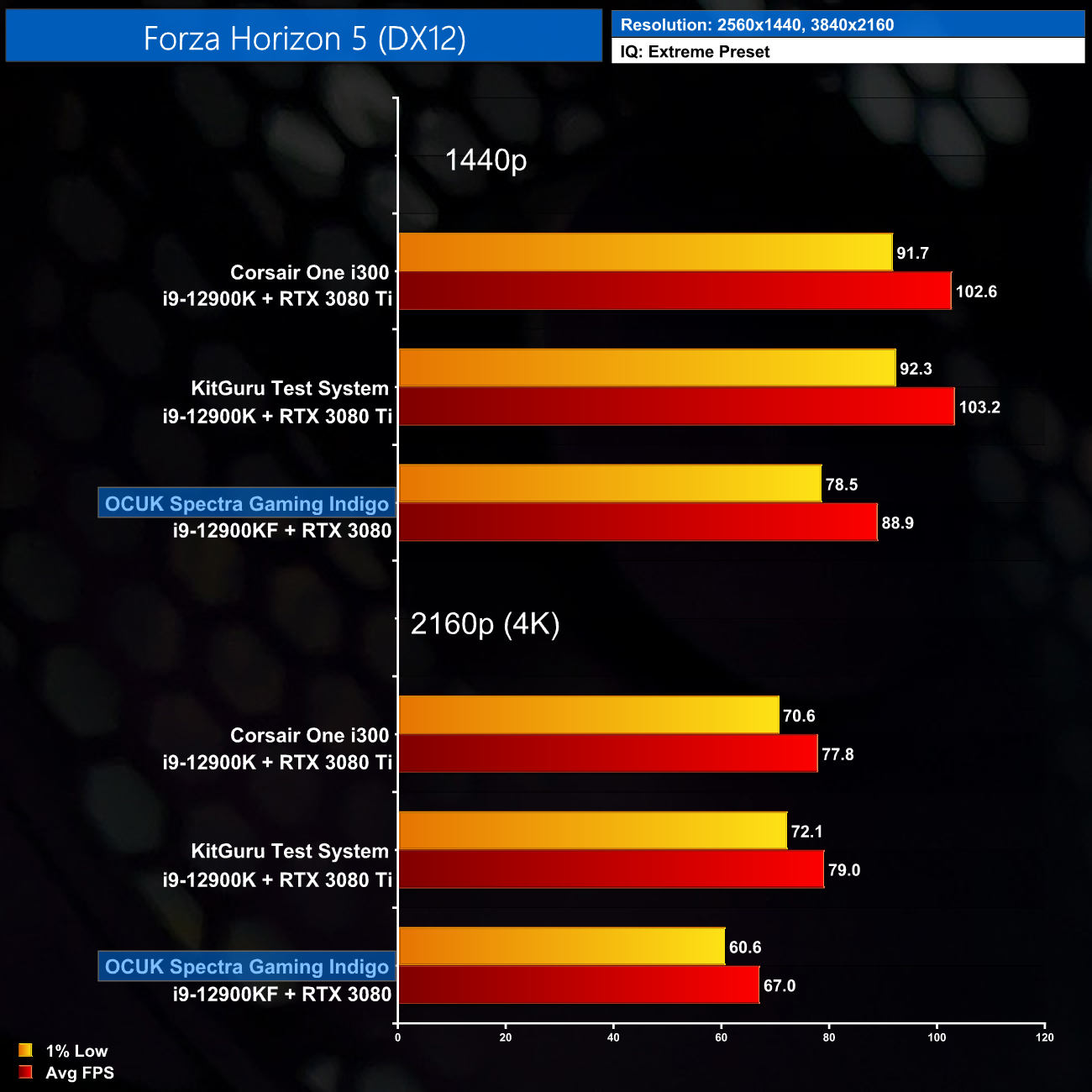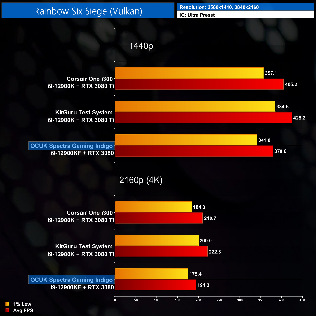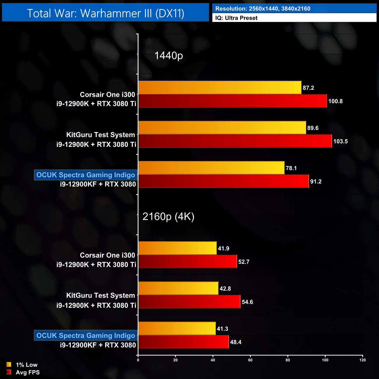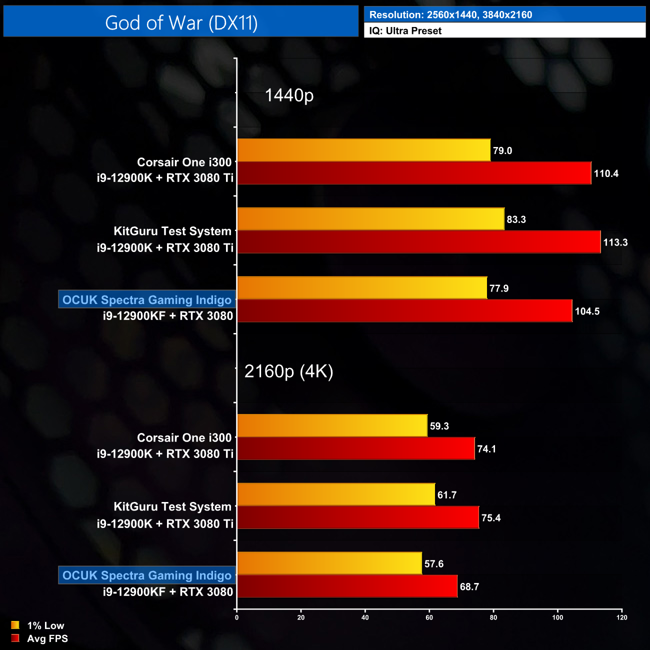 As expected, the RTX 3080 in the Indigo does reducing gaming performance by a touch compared to the other two systems, as they both have RTX 3080 Tis, but the differences are not big at all. Typically we see the Indigo coming in between 8-12% slower than the KitGuru Test System, but that still makes it a great system for high refresh 1440p gaming, and 4K is no problem too. You might not get a locked 60FPS in every title at 4K, as shown by the likes of Cyberpunk or Dying Light 2, but in plenty of other titles the frame rate is right up there.