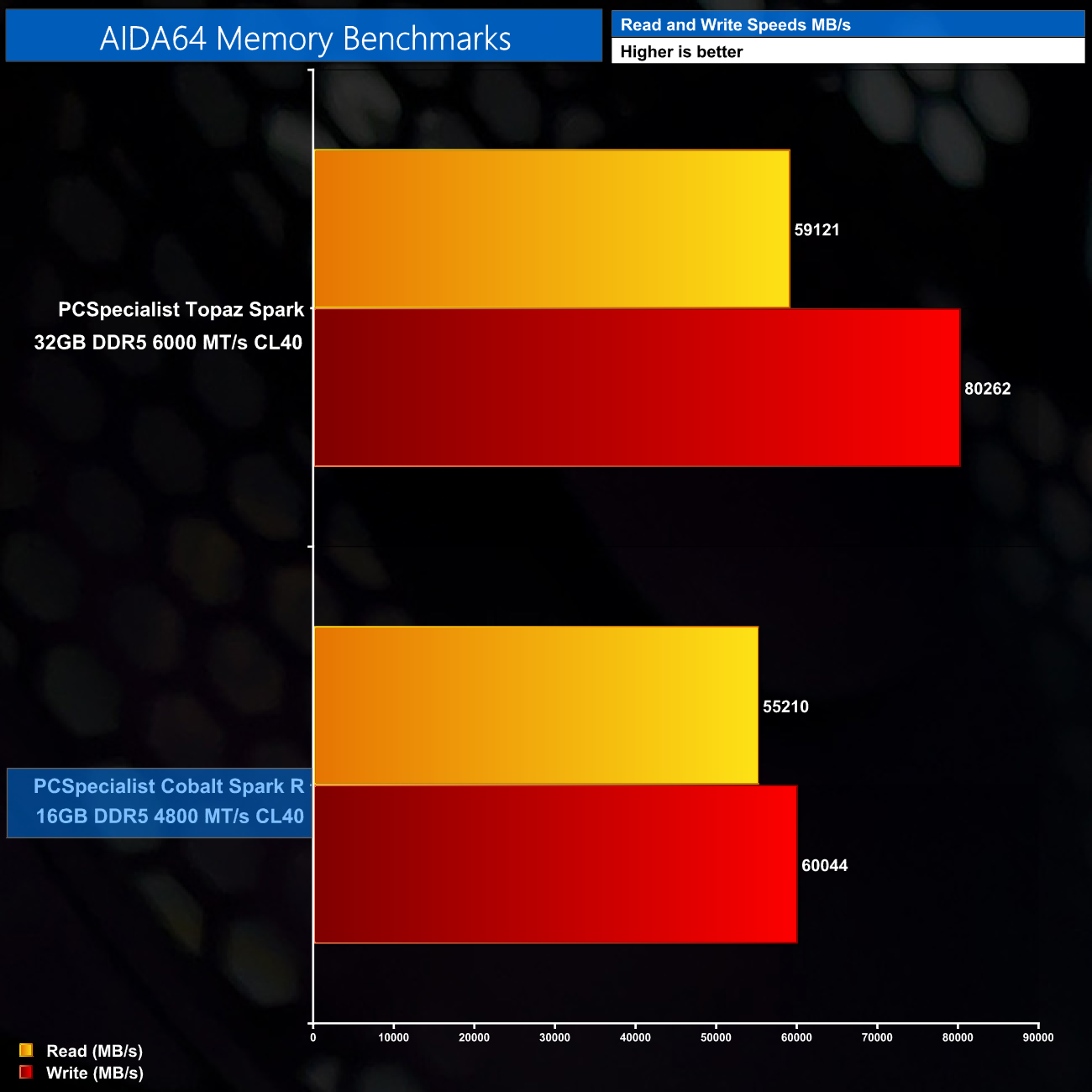 Naturally, with 16GB of fairly slow DDR5 memory, read and write speeds aren't as high as the 6000 MT/s kit found in the PCSpecialist Topaz Spark prebuilt, though they're not awful either, particularly the read speeds.