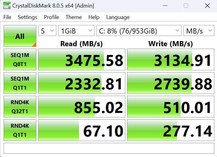 Lastly, the SSD delivers performance that is basically as advertised, we see read speeds just shy of 3.5GB/s, while writes come in a little over 3.1GB/s. It won't win any awards for raw speed, but it is absolutely fine for gaming.