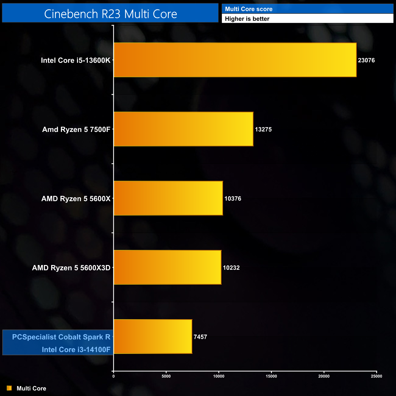 Starting our benchmarks with Cinebench Multi Core, it's not a surprise that a quad-core processor doesn't score too highly here – it's actually been some time since we benchmarked a quad-core CPU in a review so I don't have much relevant real-world data, but suffice to say the Cobalt Spark R is unlikely to be used for much rendering work.