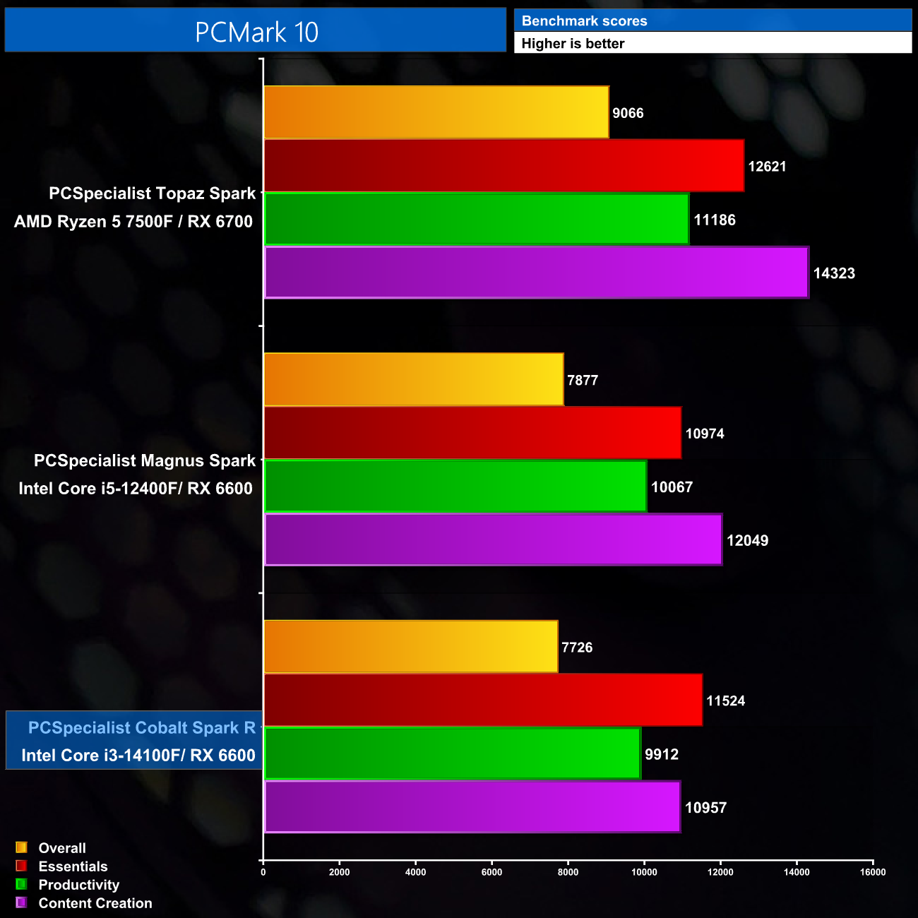 PCMark 10 also shows similar overall performance to the PCSpecialist Magnus Spark that I reviewed about a year ago – that machine cost £999 at the time of the review and offered a six-core 12400F, and the Cobalt Spark R compares reasonably well considering its lower price.