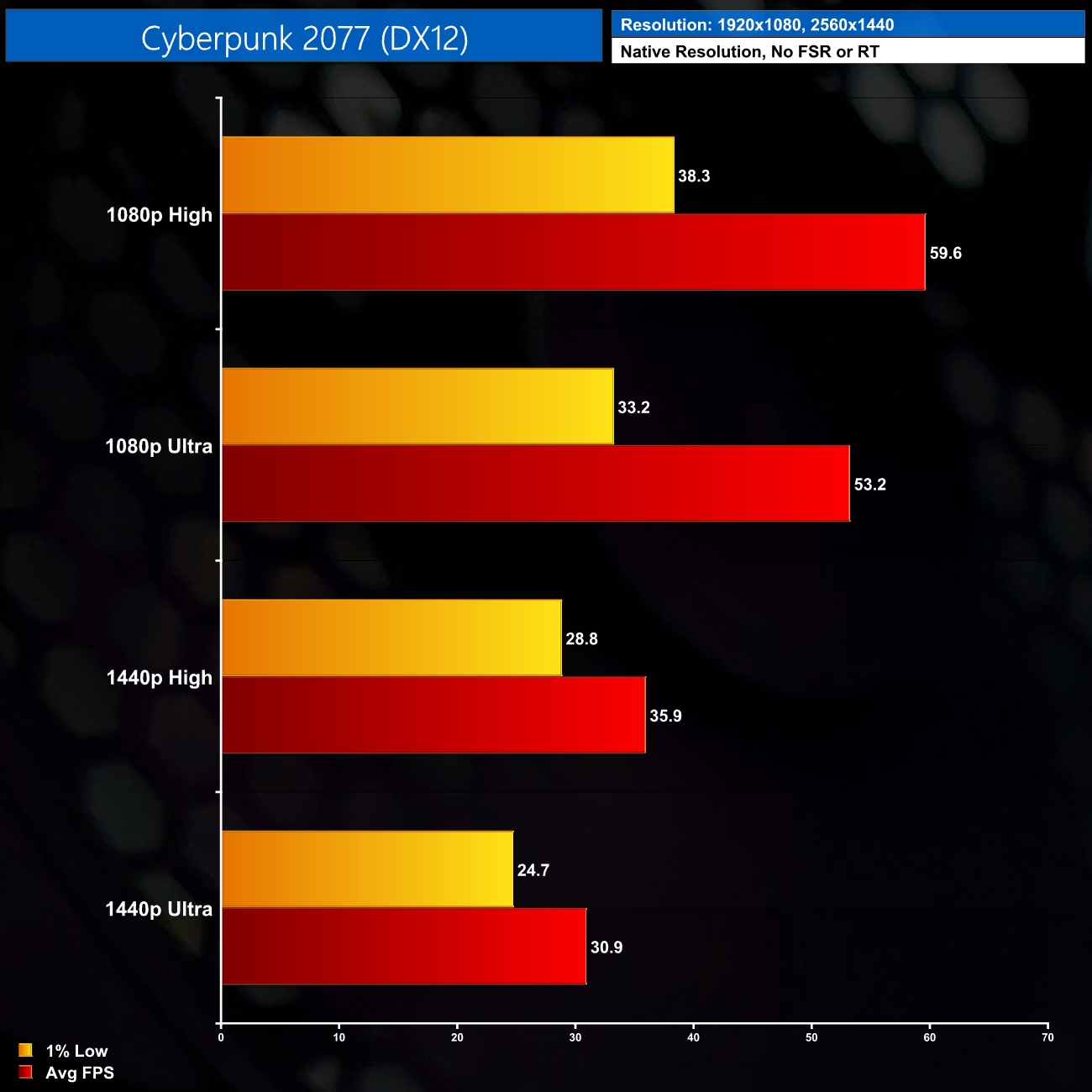 Cyberpunk 2077 is more demanding though, especially so on the CPU, but we still get reasonable performance at 1080p, with the High preset delivering almost 60FPS on average, but you wouldn't be thinking about 1440p in this title.