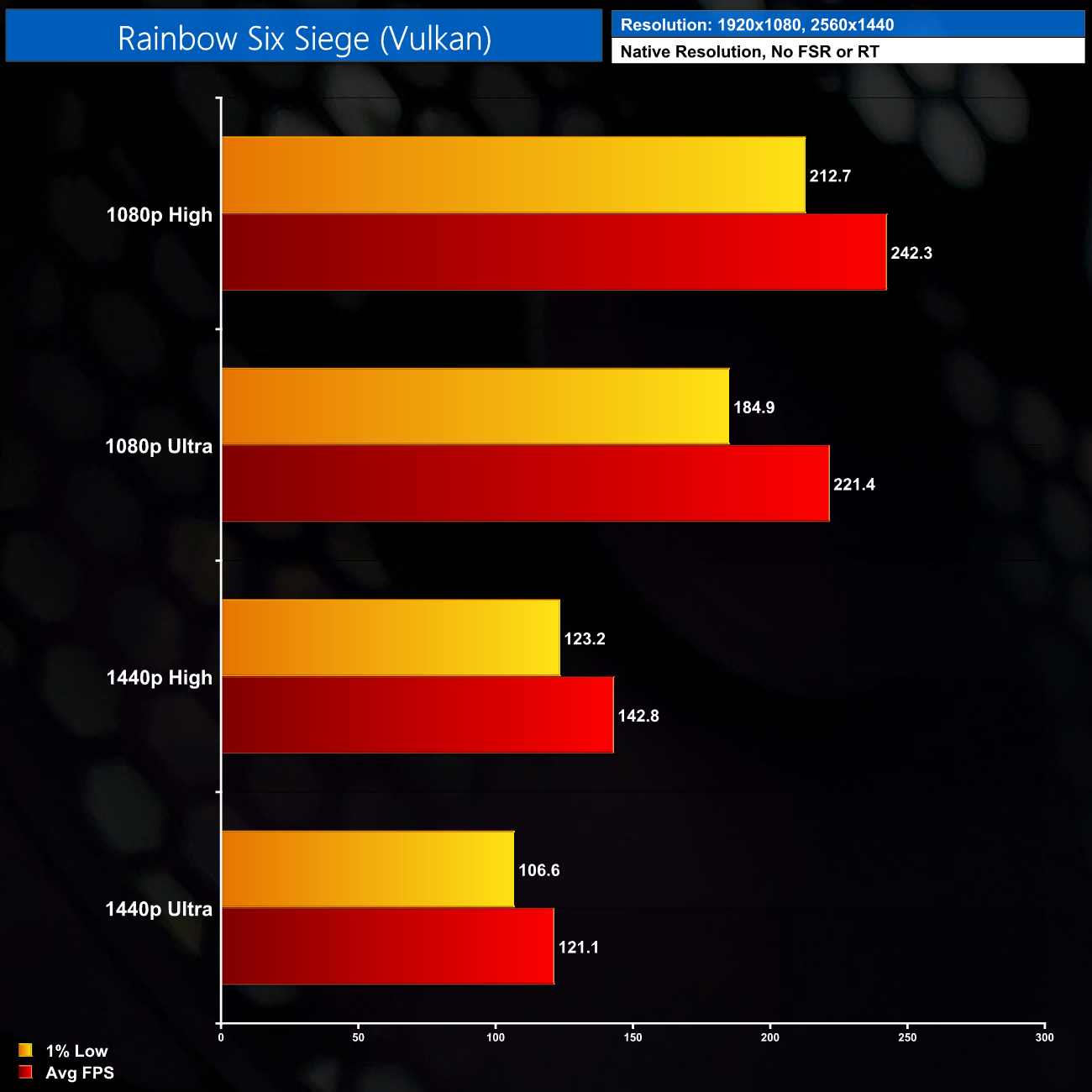 Likewise for Rainbow Six Siege, it is an older game but still very popular, and its performance is typical of other esports titles – the Cobalt Spark R delivered well over 200 FPS at 1080p, and even at 1440p Ultra settings we're still looking at 120FPS on average.