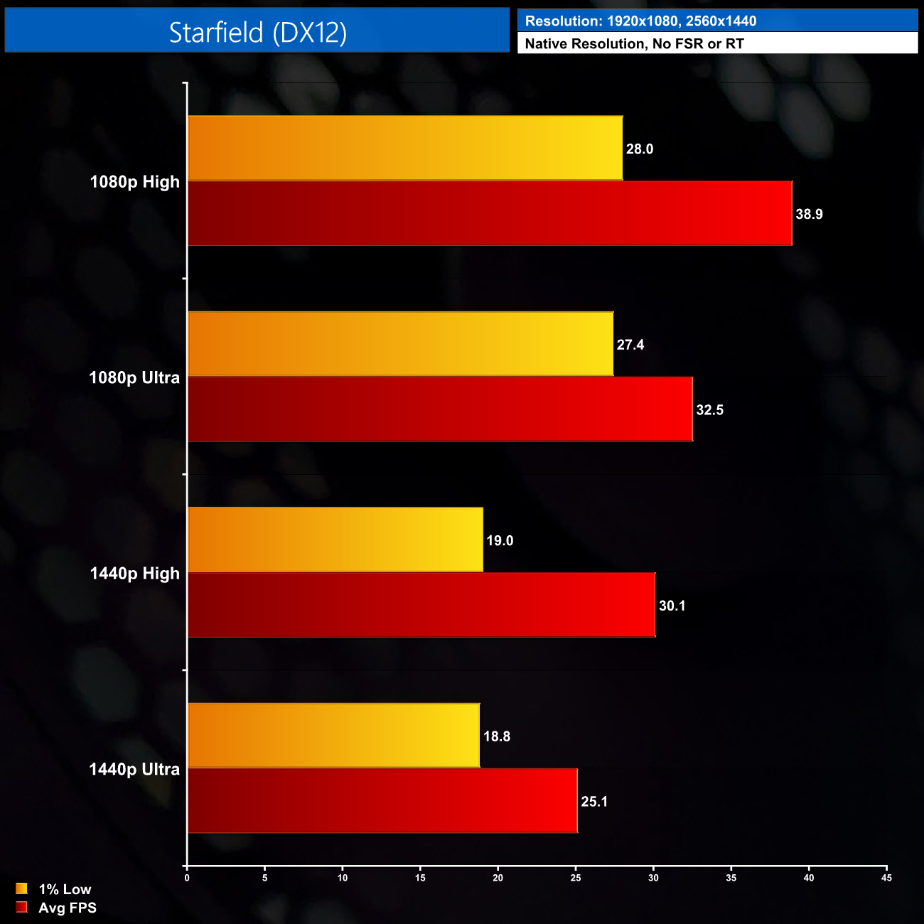 Starfield, however, shows what can happen if you have a game that's heavy on both CPU and GPU, while also not being the most optimised out there – even at 1080p using the High preset, we get just 39FPS on average, with 1% lows dipping below 30FPS.