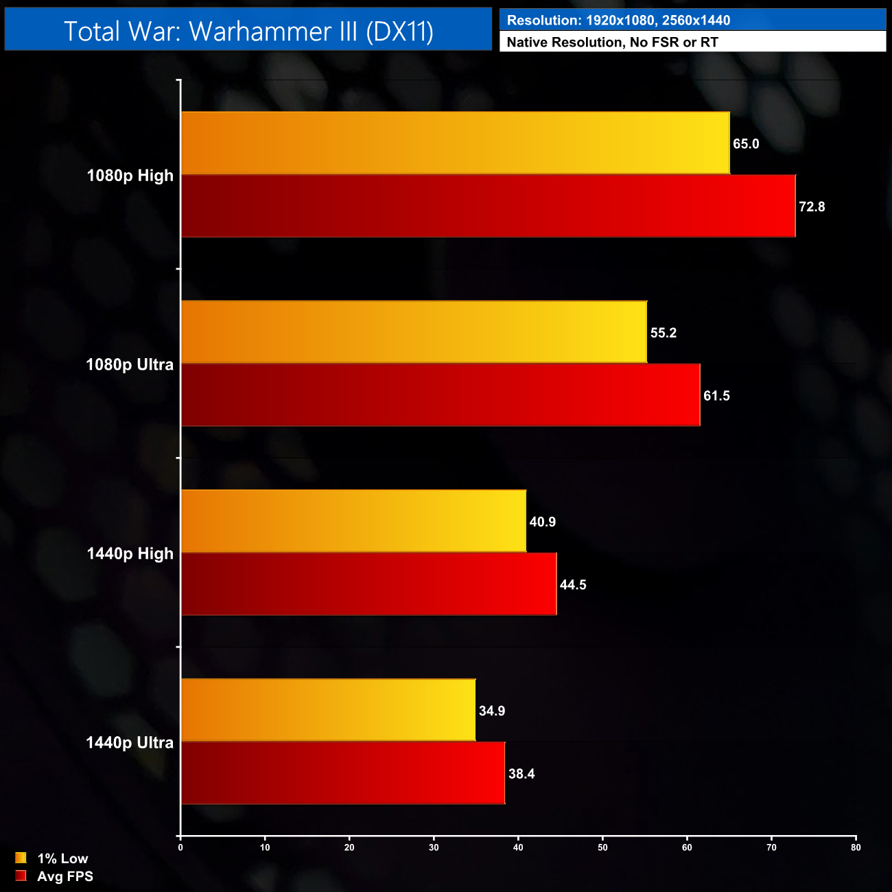 Total War: Warhammer III is fine though, it plays best at 1080p but you don't need super-high frame rates in this game, so 45FPS at 1440p High settings is also manageable.