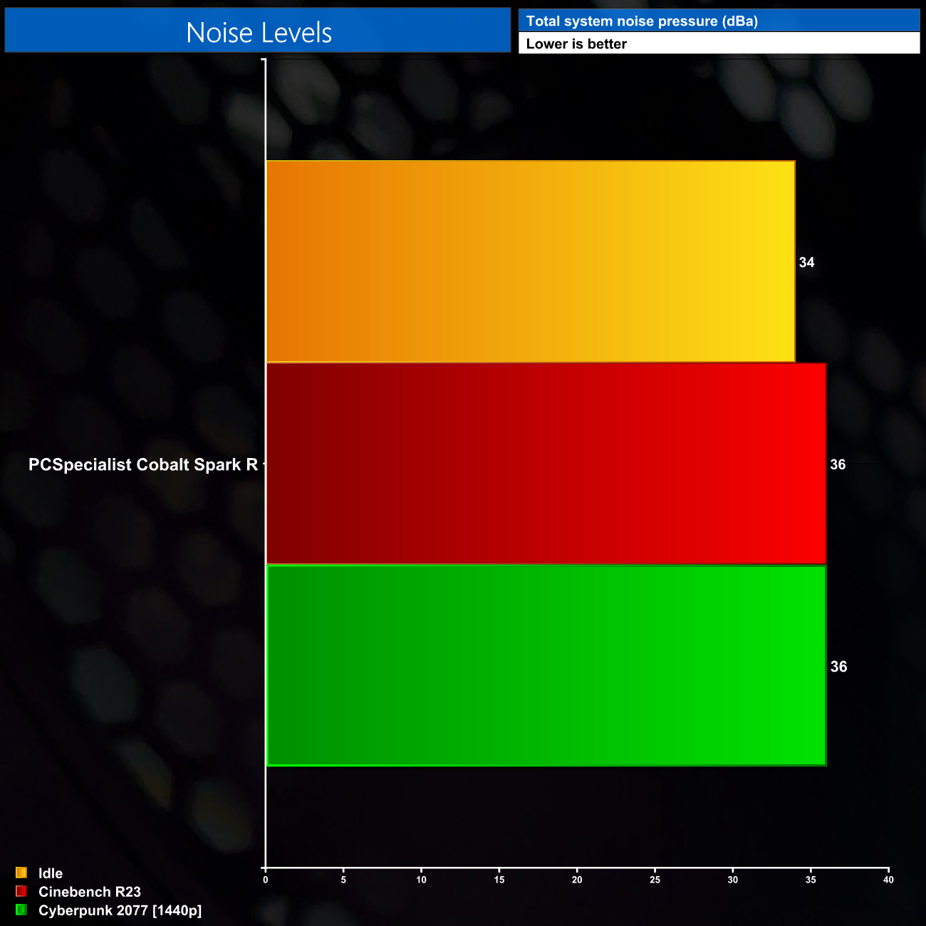 Noise levels are no problem either, in fact the fans barely spin up even when under load, as I measured noise of 36 dBa from a 30cm distance. It is just about audible while idling but the fans would easily be drowned out by even light music from a speaker set.
